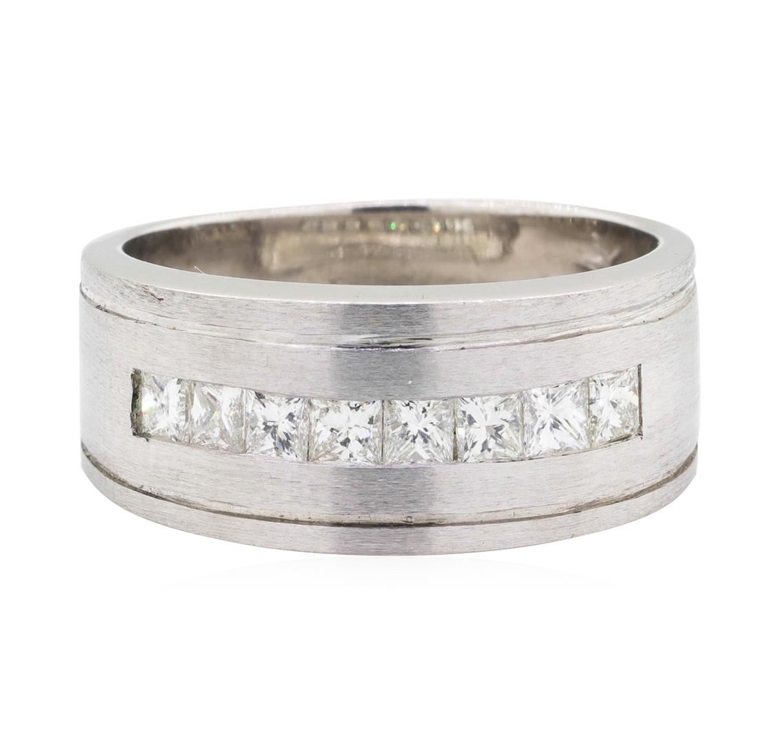 One man's ring with a satin finish featuring: 14KT white gold weighing 12.7 grams containing princess cut diamonds weighing 0.80ctw. The ring is a size 10.