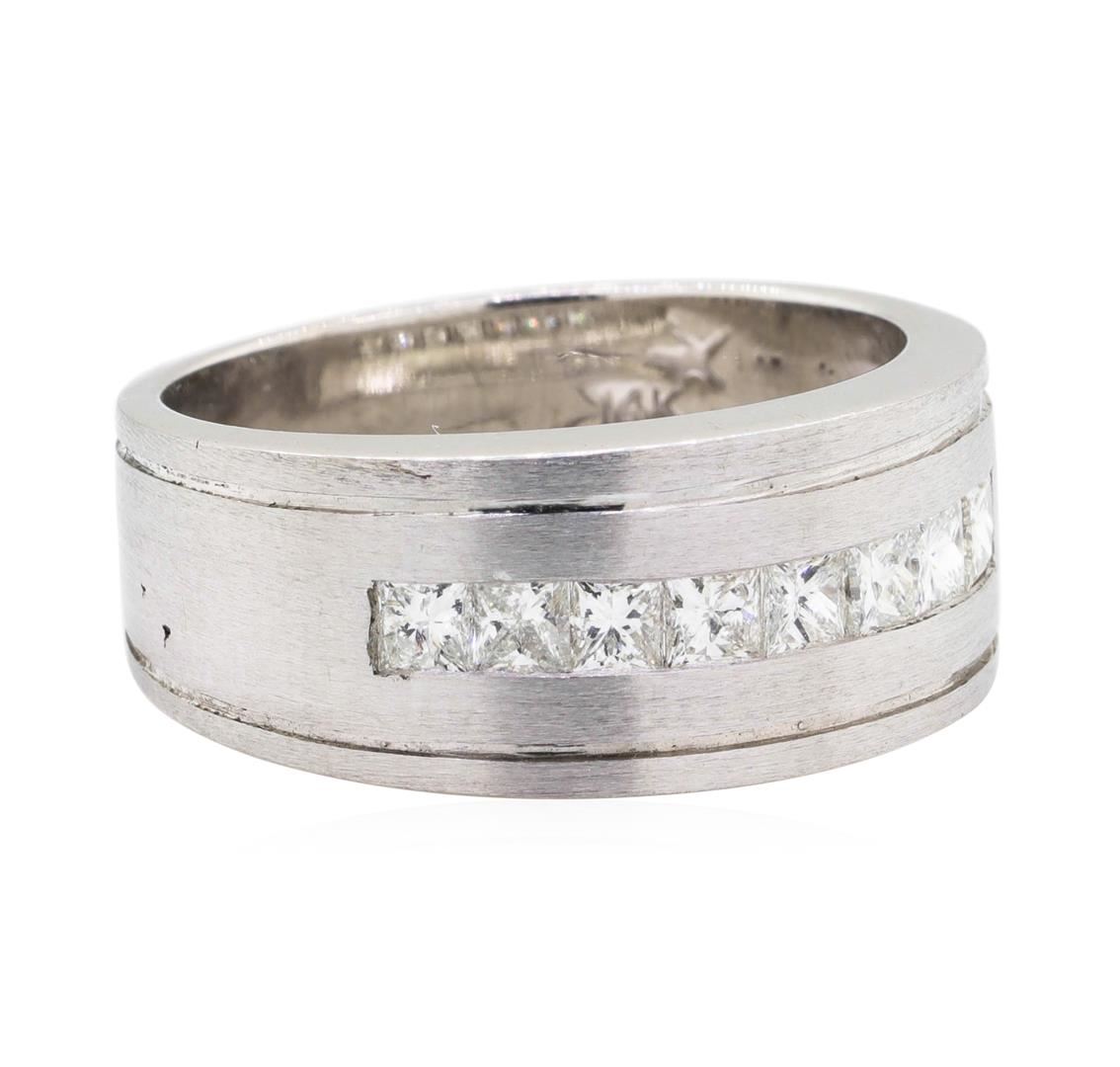 One man's ring with a satin finish featuring: 14KT white gold weighing 12.7 grams containing princess cut diamonds weighing 0.80ctw. The ring is a size 10.
