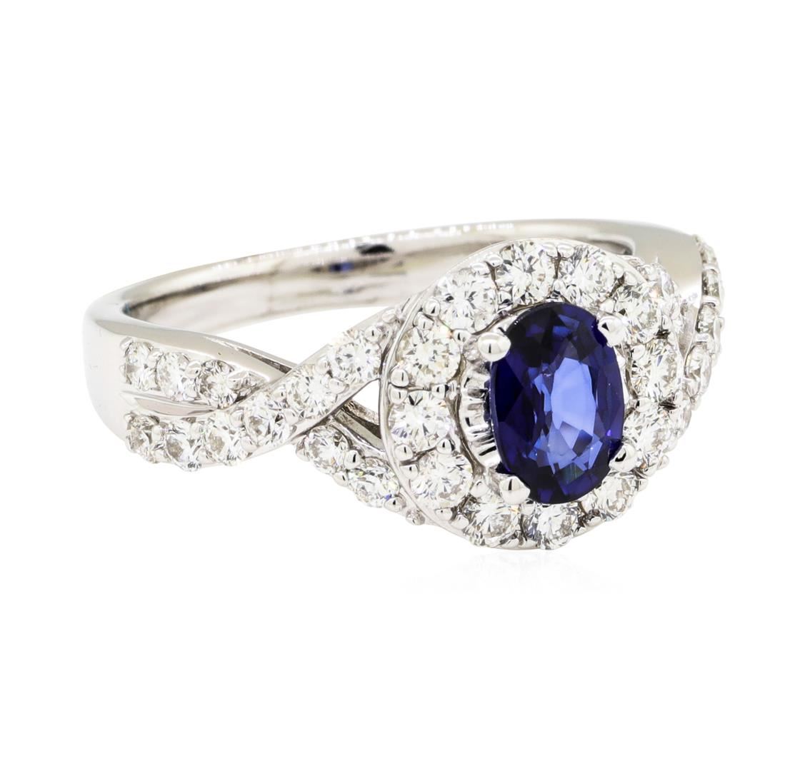 One electronically tested 14KT white gold lady's cast fashion ring with a crossover halo with a bright polish finish. The featured lady's ring has a shank measuring 2.30 millimeters wide. Identified with markings of '14K'. Condition is new, good workmanship. Containing: One prong set oval modified mixed cut natural blue sapphire, measuring 6.95 x 4.90 x 2.68mm, (depth est.) 5%. bulge factor, approximate weight of 0.80ct., clarity is eye clean, medium dark, strong, blue color, (GIA B 6/5), cut is good. Transmitting light with no distortion, transparent. Colored gemstones are presumed to have been subjected to commonly used enhancement processes. Graded in the setting. Twelve prong set round brilliant cut diamonds, measuring 2.20 - 2.10 x 1.29mm (depth est.) approximate total weight of 12 Stones = 0.45ct. Graded in the setting. Color H - I Clarity VS-1 to VS-2 Cut Very Good Twenty-Two prong set round brilliant cut diamonds, measuring 1.90 - 1.80 x 1.15mm (depth est.) approximate total weight of 22 Stones = 0.55ct. Graded in the setting. Color H - I Clarity VS-1 to VS-2 Cut Very Good. Total Weight of Colored Stones 0.80ct.. Total Weight of Diamonds 1.00ct.. Total Weight of Ring 5.50gm. GAS Appraised.