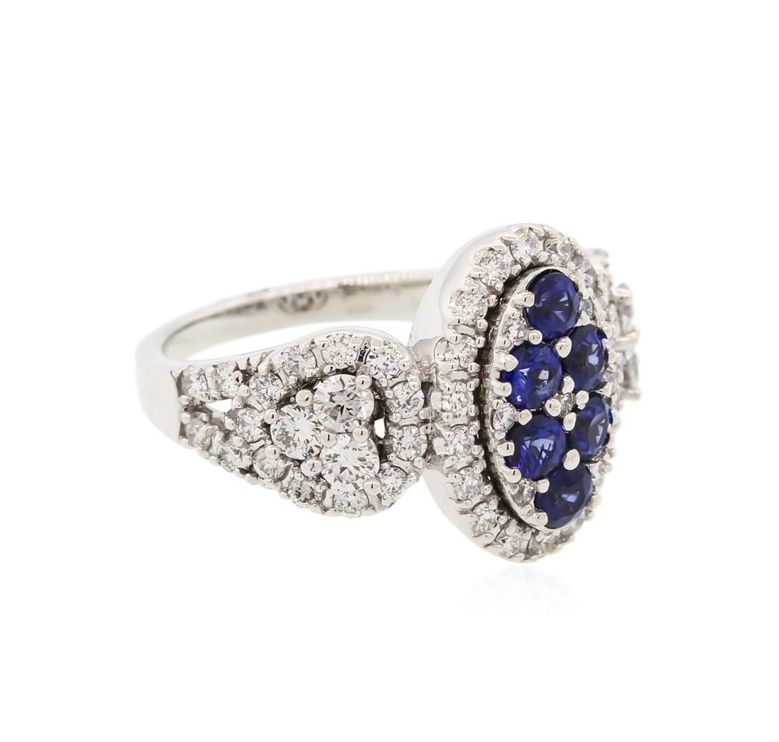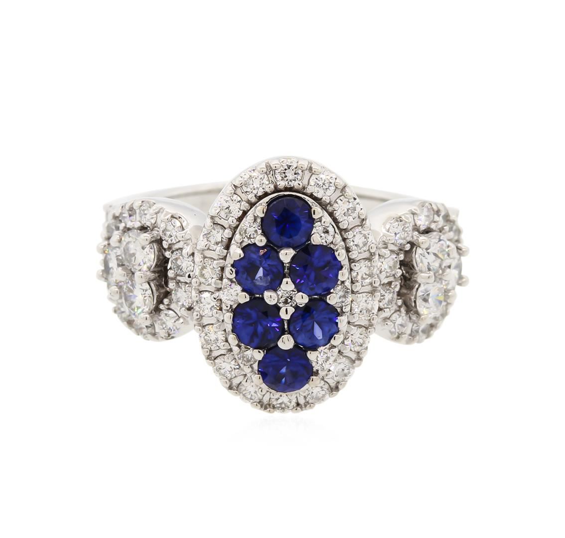 One electronically tested 14KT white gold ladies cast sapphire and diamond ring with a bright polish finish. The ring features an organized sapphire and diamond cluster set within a diamond bezel supported by elaborate diamond set shoulders, completed by a two millimeter wide band. Identified with markings of "K14". Condition is new, good workmanship. Containing: Six prong set round mixed cut natural blue sapphires, measuring 3.10 - 3.00 x 1.98 mm, exact total weight 0.80ct., clarity is slightly included, type II, dark, moderately strong, blue color, (GIA B 7/4), cut is good. Transmitting light with a minimum of distortion, transparent. Naturally occurring internal & external characteristics are present. Color grade is an average for the group. Indications of laboratory high temperature diffusion treatment. Graded in the setting. Sixty-One prong set round brilliant cut diamonds exact total weight 61 Stones = 1.24ct. Graded in the setting. Clarity: SI-1 to SI-2. Color: G - I. Total Weight of Colored Stones 0.80ct. Total Weight of Diamonds 1.24ct. Total Weight of Ring 6.67gm. AIG Appraised at $5,110.00.