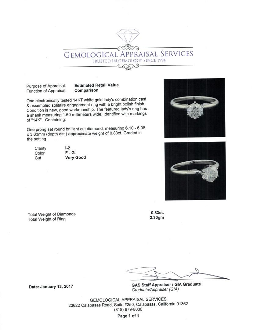 One electronically tested 14KT white gold lady's combination cast & assembled solitaire engagement ring with a bright polish finish. The featured lady's ring has a shank measuring 1.60 millimeters wide. Identified with markings of "14K". Condition is new, good workmanship. Containing: One prong set round brilliant cut diamond, measuring 6.10 - 6.08 x 3.63mm (depth est.) approximate weight of 0.83ct. Graded in the setting. Clarity: I-2. Color: F - GCut Very Good. Total Weight of Diamonds 0.83ct. Total Weight of Ring 2.30gm. GAS Appraised.