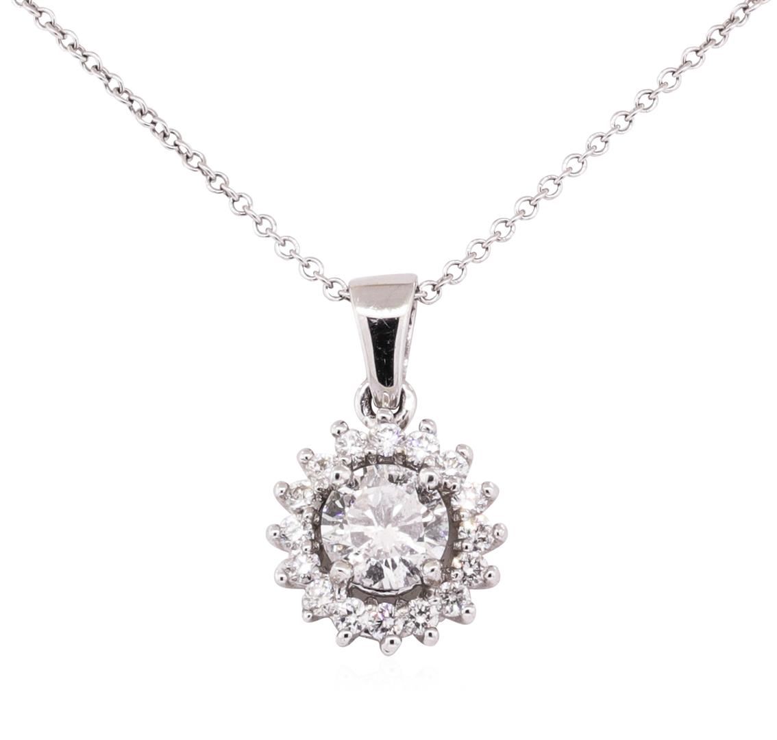 One electronically tested 14KT white gold lady's combination cast & assembled fashion pendant & chain 16.0' long, 1mm round cable link with a spring ring clasp with a bright polish finish. Identified with markings of '14K'. Condition is new, good workmanship. Containing: One prong set round brilliant cut diamond, measuring 5.58 - 5.56 x 3.29mm (depth est.) approximate weight of 0.63ct. Graded in the setting. Color G - H, Clarity I-1, Cut Very Good Sixteen prong set round brilliant cut diamonds, measuring 1.55 - 1.50 x 0.95mm (depth est.) approximate total weight of 16 Stones = 0.22ct. Graded in the setting. Color H - I, Clarity SI-1 to SI-2, Cut Very Good. Total Weight of Diamonds 0.85ct. Total Weight of Pendant & Chain 2.50gm. GAS Appraised.