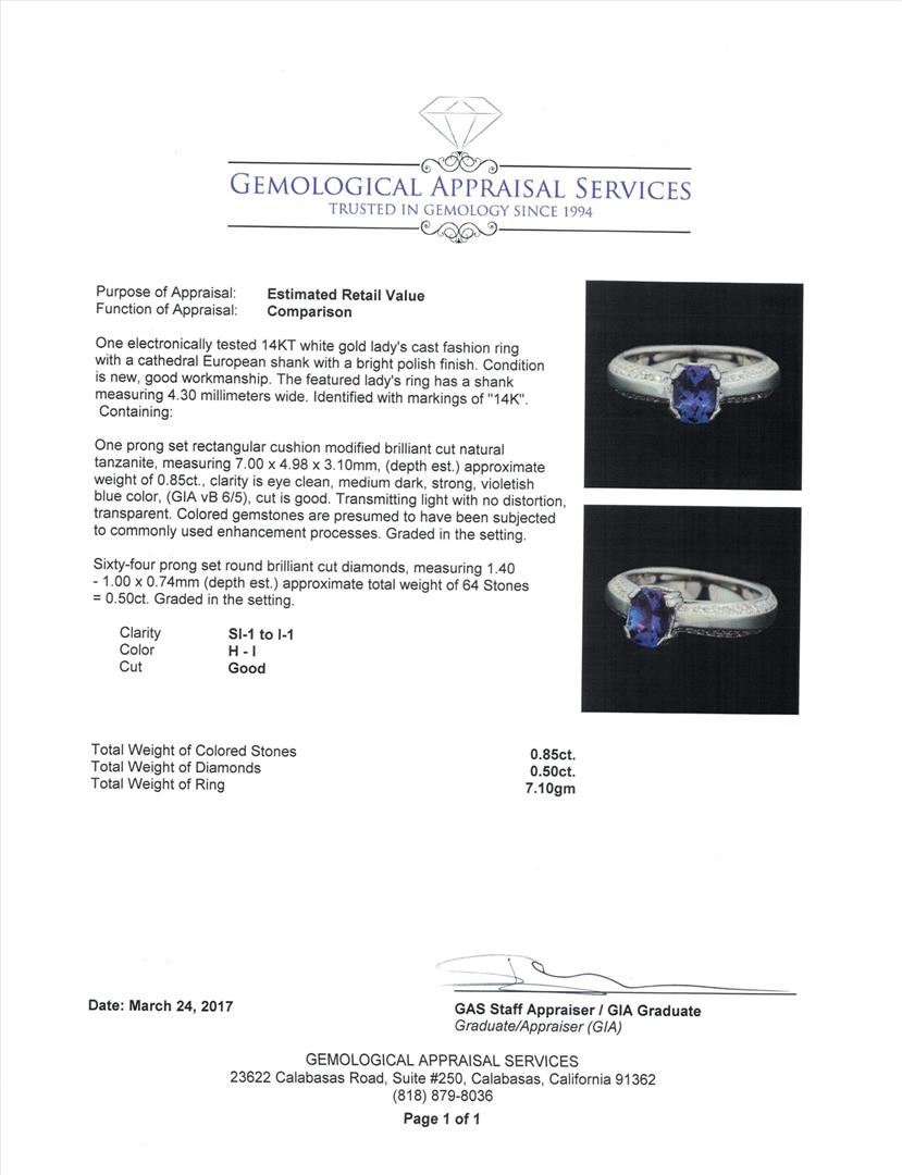 One electronically tested 14KT white gold lady's cast fashion ring with a cathedral European shank with a bright polish finish. The featured lady's ring has a shank measuring 4.30 millimeters wide. Identified with markings of "14K". Condition is new, good workmanship. Containing: One prong set rectangular cushion modified brilliant cut natural tanzanite, measuring 7.00 x 4.98 x 3.10mm, (depth est.) approximate weight of 0.85ct., clarity is eye clean, medium dark, strong, violetish blue color, (GIA vB 6/5), cut is good. Transmitting light with no distortion, transparent. Colored gemstones are presumed to have been subjected to commonly used enhancement processes. Graded in the setting. Sixty-Four prong set round brilliant cut diamonds, measuring 1.40 - 1.00 x 0.74mm (depth est.) approximate. Total Weight of 64 Stones = 0.50ct. Graded in the setting. Color H - I Clarity SI-1 to I-1 Cut Good. Total Weight of Colored Stones 0.85ct.. Total Weight of Diamonds 0.50ct.. Total Weight of Ring 7.10gm. GAS Appraised.