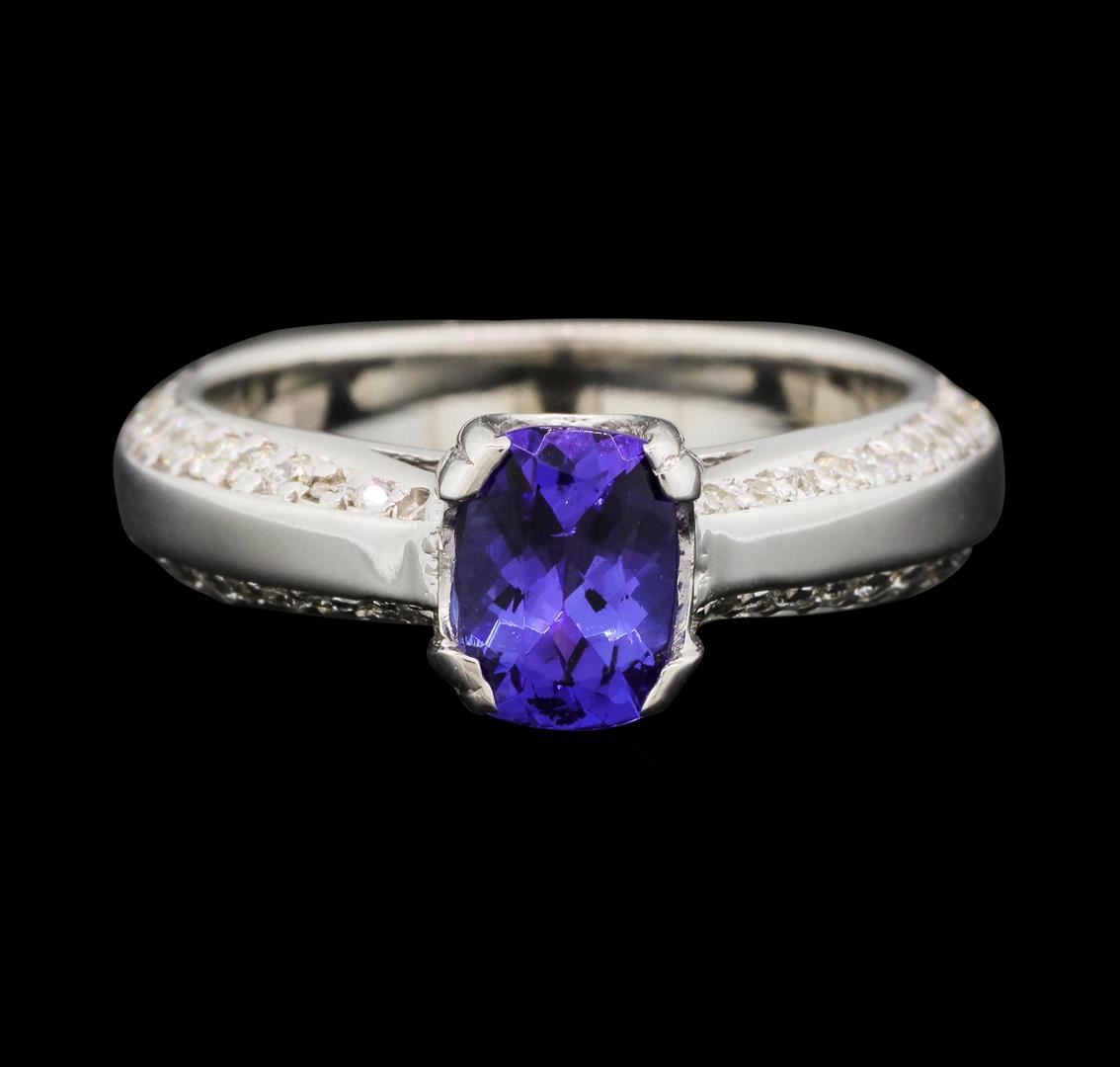 One electronically tested 14KT white gold lady's cast fashion ring with a cathedral European shank with a bright polish finish. The featured lady's ring has a shank measuring 4.30 millimeters wide. Identified with markings of "14K". Condition is new, good workmanship. Containing: One prong set rectangular cushion modified brilliant cut natural tanzanite, measuring 7.00 x 4.98 x 3.10mm, (depth est.) approximate weight of 0.85ct., clarity is eye clean, medium dark, strong, violetish blue color, (GIA vB 6/5), cut is good. Transmitting light with no distortion, transparent. Colored gemstones are presumed to have been subjected to commonly used enhancement processes. Graded in the setting. Sixty-Four prong set round brilliant cut diamonds, measuring 1.40 - 1.00 x 0.74mm (depth est.) approximate. Total Weight of 64 Stones = 0.50ct. Graded in the setting. Color H - I Clarity SI-1 to I-1 Cut Good. Total Weight of Colored Stones 0.85ct.. Total Weight of Diamonds 0.50ct.. Total Weight of Ring 7.10gm. GAS Appraised.