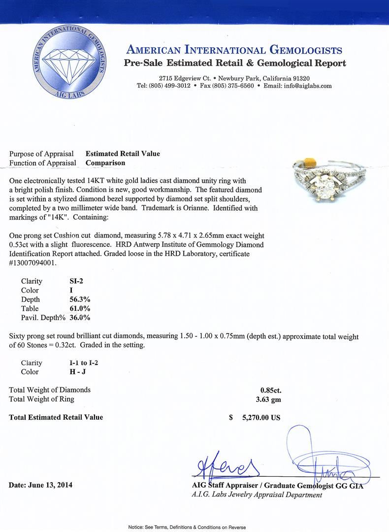 One electronically tested 14KT white gold ladies cast diamond unity ring with a bright polish finish. The featured diamond is set within a stylized diamond bezel supported by diamond set split shoulders, completed by a two millimeter wide band. Trademark is Orianne. Identified with markings of "14K". Condition is new, good workmanship. Containing: One prong set Cushion cut diamond, measuring 5.78 x 4.71 x 2.65mm exact weight 0.53ct with a slight fluorescence. HRD Antwerp Institute of Gemmology Diamond Identification Report attached. Graded loose in the HRD Laboratory, certificate #13007094001. Clarity: SI-2. Color: IDepth 56.3%. Table 61.0%. Pavil. Depth%. 36.0%. Sixty prong set round brilliant cut diamonds, measuring 1.50 - 1.00 x 0.75mm (depth est.) approximate. Total Weight of 60 Stones = 0.32ct. Graded in the setting. Clarity: I-1 to I-2. Color: H - J. Total Weight of Diamonds 0.85ct. AIG Appraised at $5,270.00.