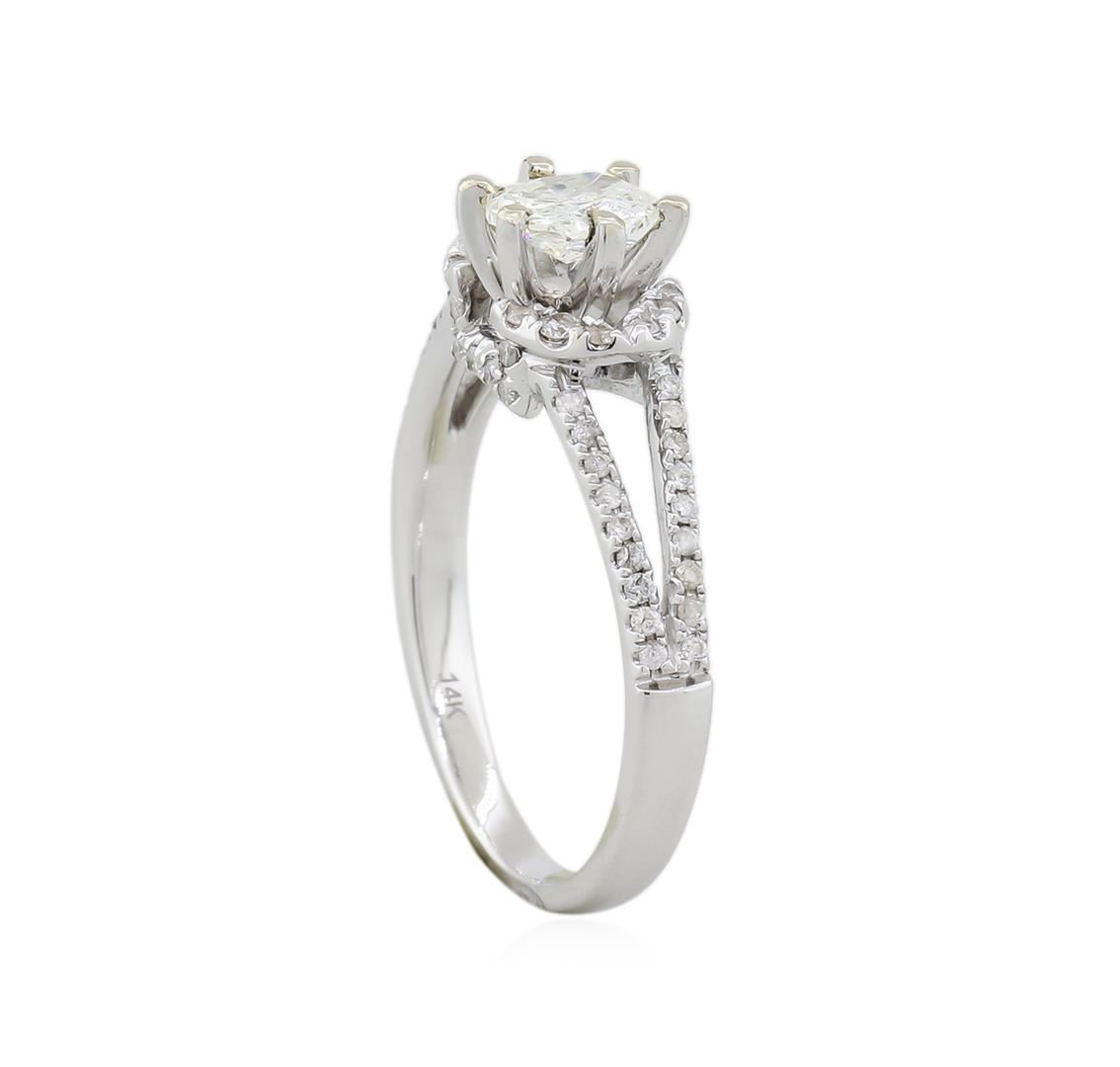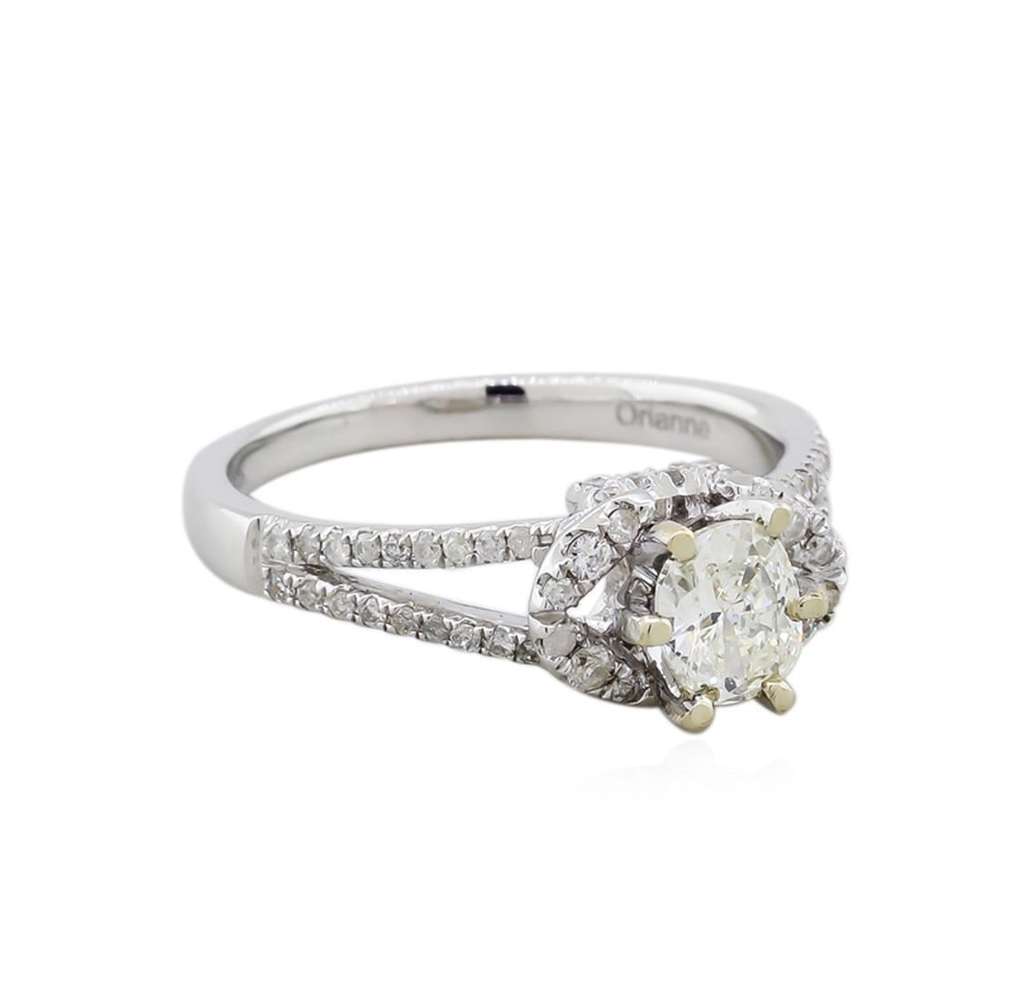 One electronically tested 14KT white gold ladies cast diamond unity ring with a bright polish finish. The featured diamond is set within a stylized diamond bezel supported by diamond set split shoulders, completed by a two millimeter wide band. Trademark is Orianne. Identified with markings of "14K". Condition is new, good workmanship. Containing: One prong set Cushion cut diamond, measuring 5.78 x 4.71 x 2.65mm exact weight 0.53ct with a slight fluorescence. HRD Antwerp Institute of Gemmology Diamond Identification Report attached. Graded loose in the HRD Laboratory, certificate #13007094001. Clarity: SI-2. Color: IDepth 56.3%. Table 61.0%. Pavil. Depth%. 36.0%. Sixty prong set round brilliant cut diamonds, measuring 1.50 - 1.00 x 0.75mm (depth est.) approximate. Total Weight of 60 Stones = 0.32ct. Graded in the setting. Clarity: I-1 to I-2. Color: H - J. Total Weight of Diamonds 0.85ct. AIG Appraised at $5,270.00.