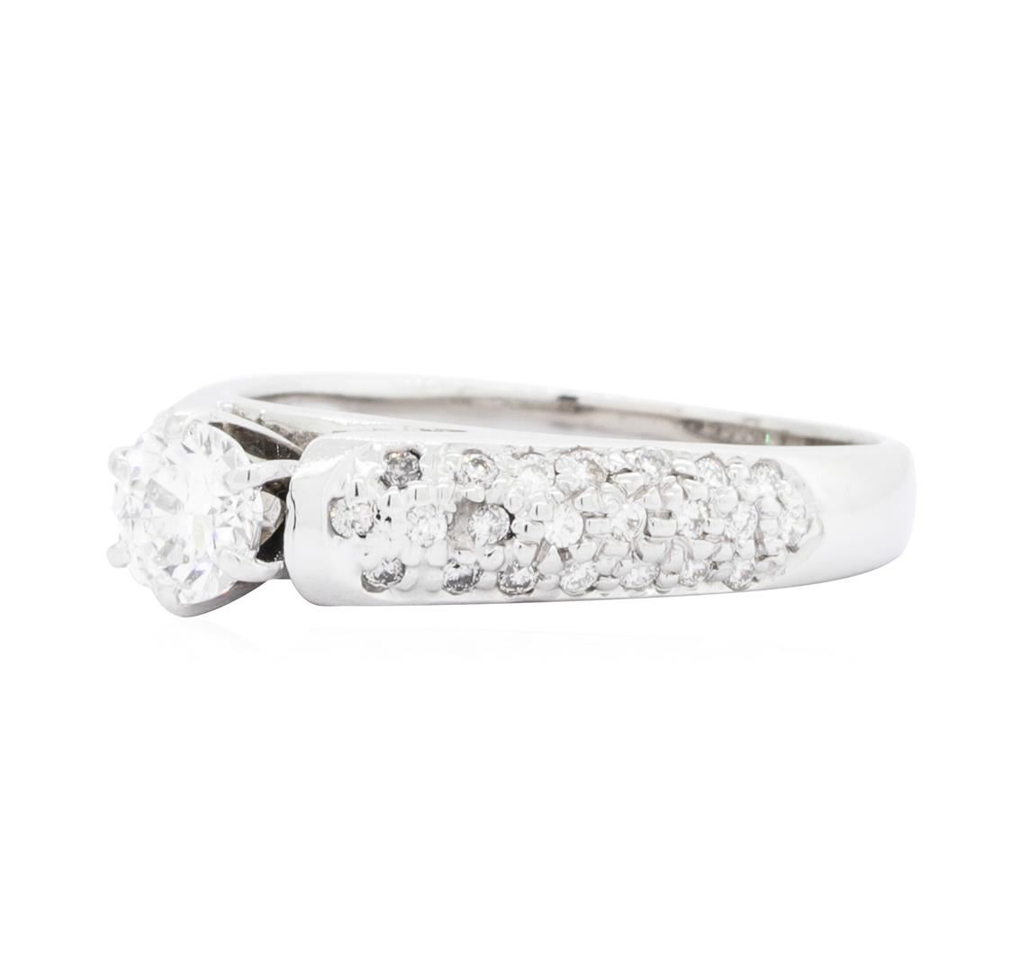 One electronically tested 14KT white gold Ladies cast wedding ring with a tapered cathedral shank with a bright polish finish. The featured Ladies ring has a shank measuring 2.57 millimeters wide. Identified with markings of '14K'. Condition is like new, good workmanship. Containing: One prong set round brilliant cut diamond, measuring 4.95 - 4.92 x 3.06mm (depth est.) approximate weight of 0.45ct. Graded in the setting. Color H Clarity SI-1 Cut Good Forty-Four prong set round brilliant cut diamonds, measuring 1.40 - 1.30 x 0.84mm (depth est.) approximate total weight of 44 Stones = 0.41ct. Graded in the setting. Color H - I Clarity SI-1 to SI-2 Cut Good. Total Weight of Diamonds 0.86ct. Total Weight of Ring 4.40gm. GAS Appraised.