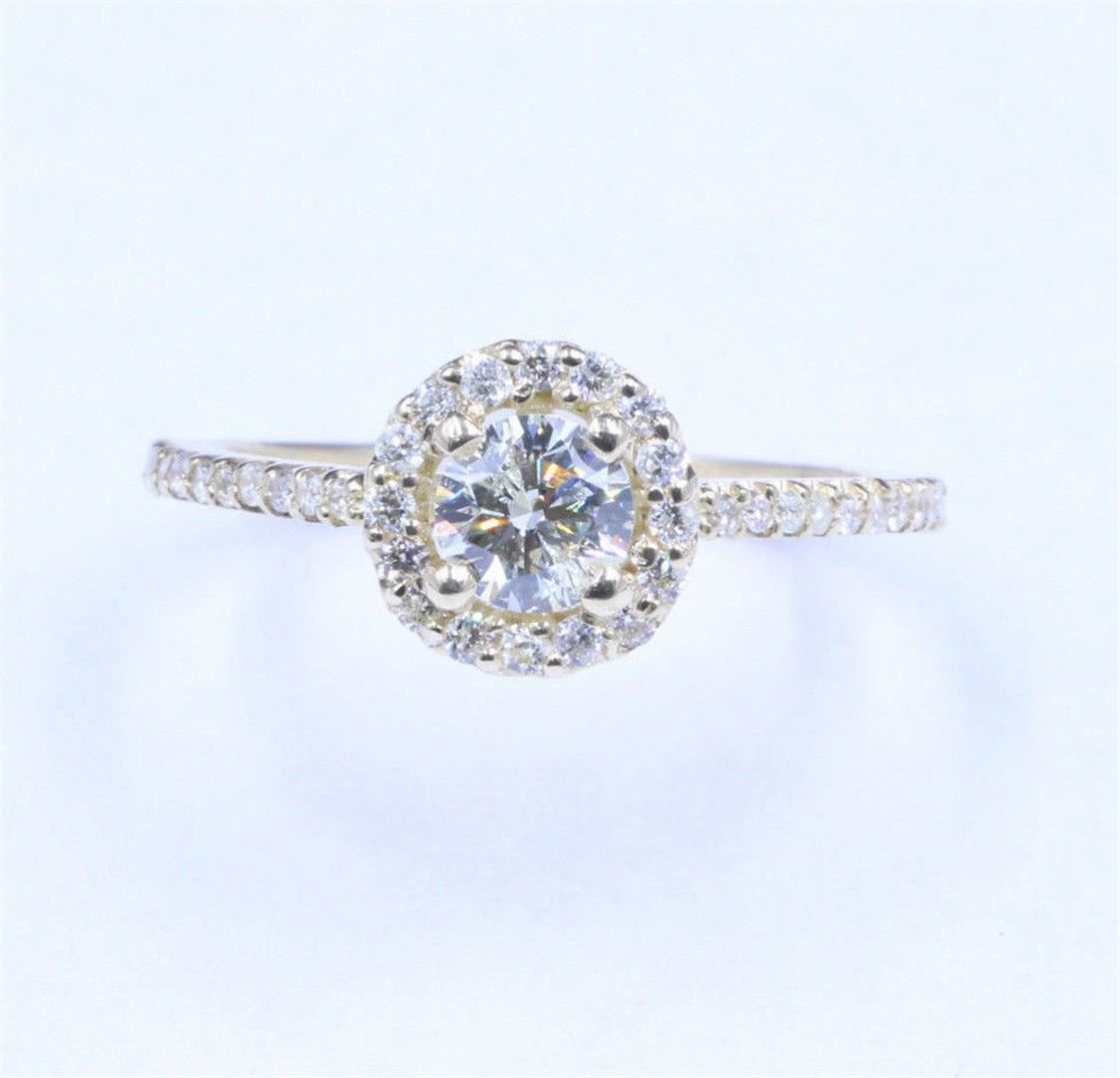 One Ladies Halo Style Diamond Engagement Ring in 14k Gold. The setting style is solitaire with accents and halo design. Condition is brand new. Gross weight is 1.83 grams with a total of 33 stones. Size 6.25 but can be resized free of charge. Main stone is natural and non-enhanced. Main diamond is 0.63 carats, shape brilliant round cut, clarity SI1, color H1, and cut is very good. The side stone is natural and non-enhanced. Side diamonds are a total of 0.23 carats. Side diamond shape is brilliant round cut, clarity SI1, color G, and cut is very good. There is a total of 32 side diamonds.