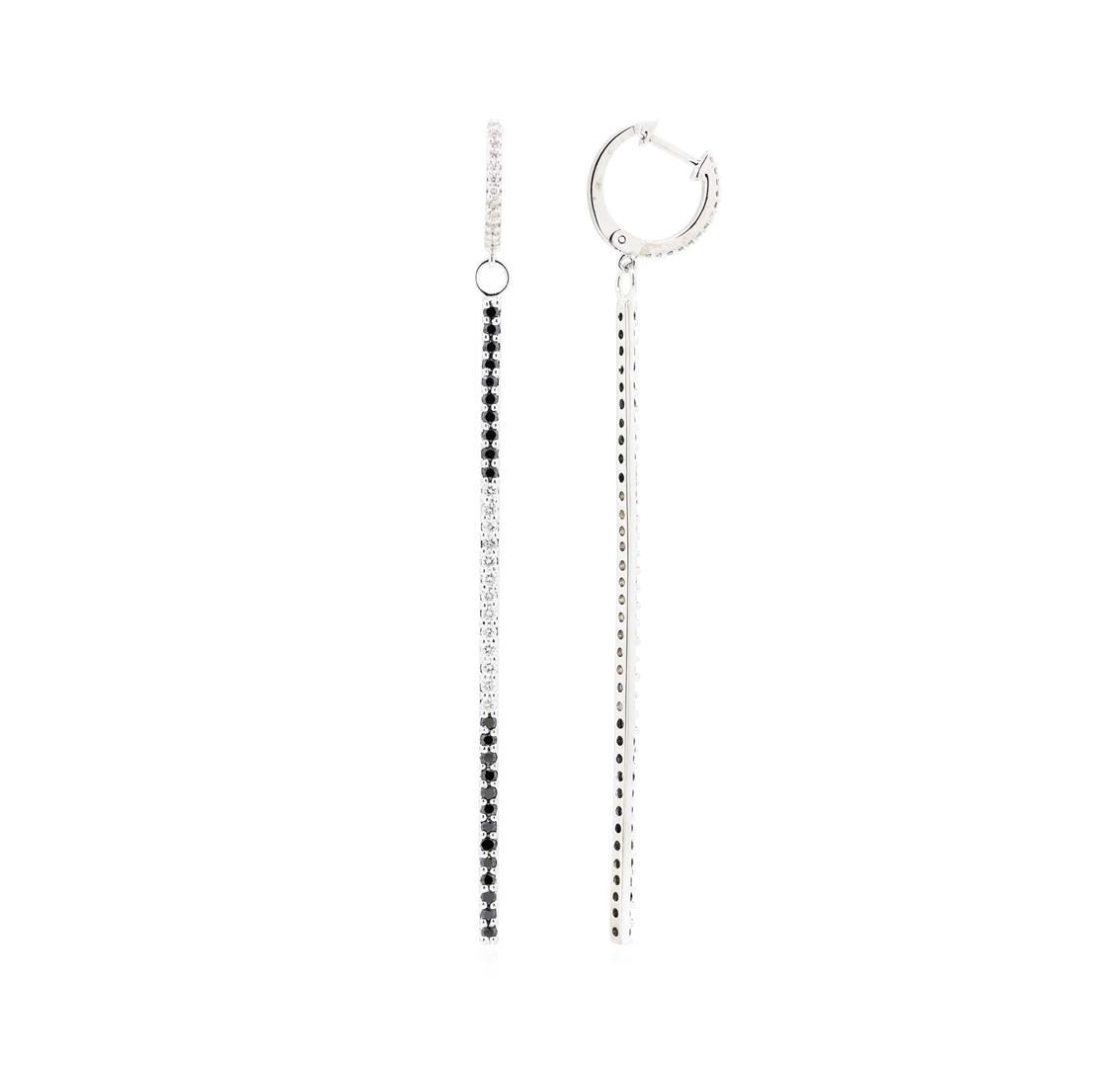 One pair electronically tested 14KT white gold Ladies combination cast & assembled fashion dangle earrings with hinged clip backs with a bright polish finish. The featured Ladies earrings have a drop of approximately 75 millimeters. Identified with markings of '14K'. Condition is new, good workmanship. Containing: Twenty-Six prong set round brilliant cut diamonds, measuring 1.50 - 1.40 x 0.90mm (depth est.) approximate total weight of 26 Stones = 0.30ct. Graded in the setting. Color Fancy Black Cut Good Forty-Six prong set round brilliant cut diamonds, measuring 1.50 - 1.40 x 0.87mm (depth est.) approximate total weight of 46 Stones = 0.50ct. Graded in the setting. Color H - I Clarity SI-1 to I-1 Cut Good Twenty-Six prong set round brilliant cut diamonds, measuring 1.00 - 0.95 x 0.61mm (depth est.) approximate total weight of 26 Stones = 0.09ct. Graded in the setting. Color H - I Clarity SI-1 to SI-2 Cut Good. Total Weight of Diamonds 0.89ct.. Total Weight of Earrings 4.20gm. GAS Appraised.