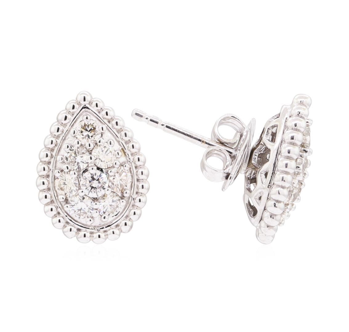 One pair of pear shaped cluster stud earrings featuring: 14KT white gold weighing 4.5 grams containing diamonds weighing 0.93ctw.