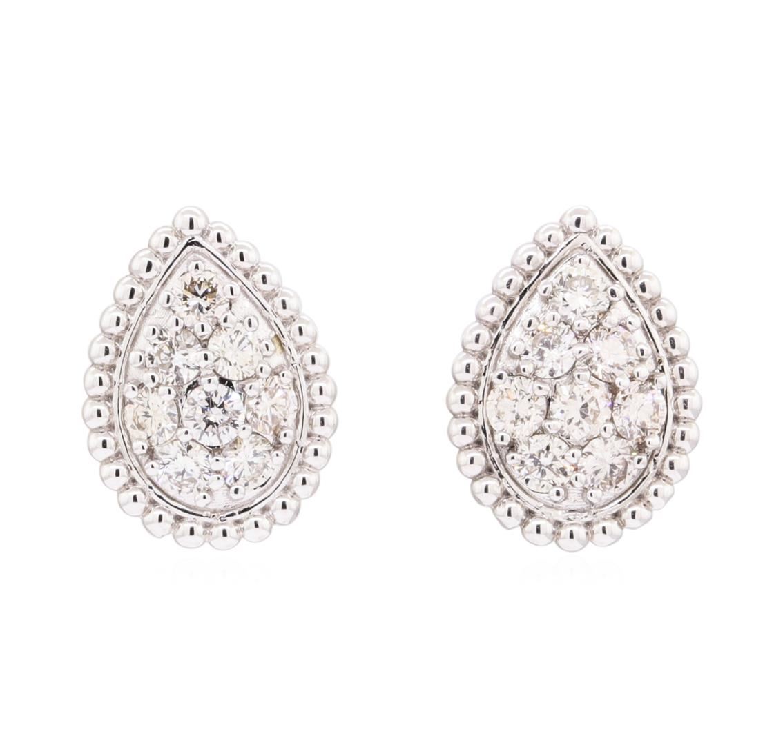 One pair of pear shaped cluster stud earrings featuring: 14KT white gold weighing 4.5 grams containing diamonds weighing 0.93ctw.