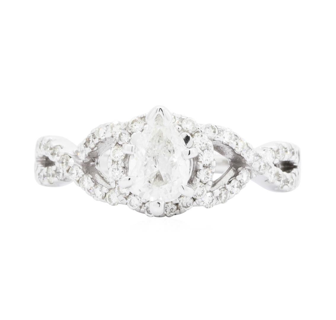 One electronically tested 14KT white gold Ladies cast wedding ring with a crossover halo with a bright polish finish. The featured Ladies ring has a shank measuring 1.50 millimeters wide. Identified with markings of '14K'. Condition is new, good workmanship. Containing: One prong set pear shaped cut diamond, measuring 6.10 x 4.30 x 2.71mm (depth est.) approximate weight of 0.44ct. Graded in the setting. Color G - H Clarity I-2 Cut Good Fifty prong set round brilliant cut diamonds, measuring 1.40 - 1.35 x 0.86mm (depth est.) approximate total weight of 50 Stones = 0.50ct. Graded in the setting. Color G - H Clarity VS-2 to SI-1 Cut Very Good. Total Weight of Diamonds 0.94ct. Total Weight of Ring 3.30gm. GAS Appraised.
