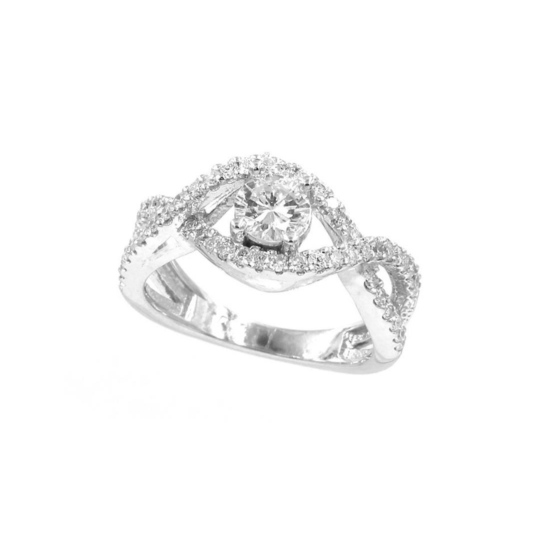 One Round Cut Diamond Woman's Wedding Engagement Ring in 14k White Gold. Setting style is solitaire with accents / halo design. Total carat weight is 0.94 carats. Gross gram weight is 3.68 grams. Ring includes a total of 51 stones. Size 5 but can be resized free of charge. Main stone is natural and non-enhanced. Main diamond is 0.46 carats, shape is brilliant round cut, clarity SI1, color H - I, and cut is very good. Side stones are natural and non-enhanced. Side diamonds total carat weight is 0.48 carats. Shape is brilliant round cut, clarity SI1, color H - I, and cut is very good with a total of 50 side diamonds.