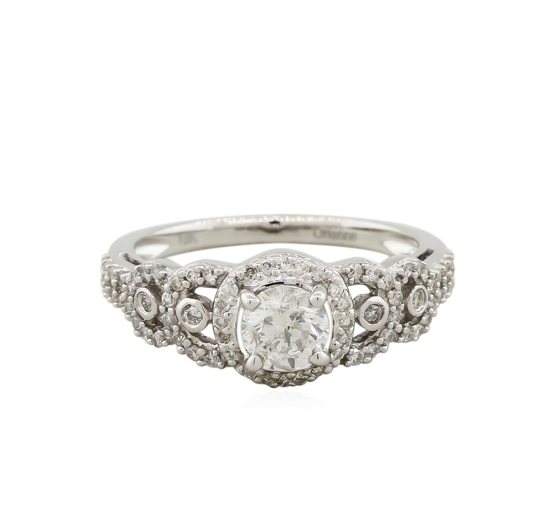 14KT white gold round brilliant cut diamond ring. A round brilliant cut diamond weighing in at an aproximate 0.60 carats is prong mounted in the center of the ring. Approximately 0.34 carats of round brilliant cut diamonds accent the ring around the center gemstones and on both sides. The ring is cast stamped "14K" and has a gross weight of 4.7 grams. The diamonds have an average clarity of I1, color G-J. Finish: High polish. Condition: Excellent GAS Appraised at $7,970.00.