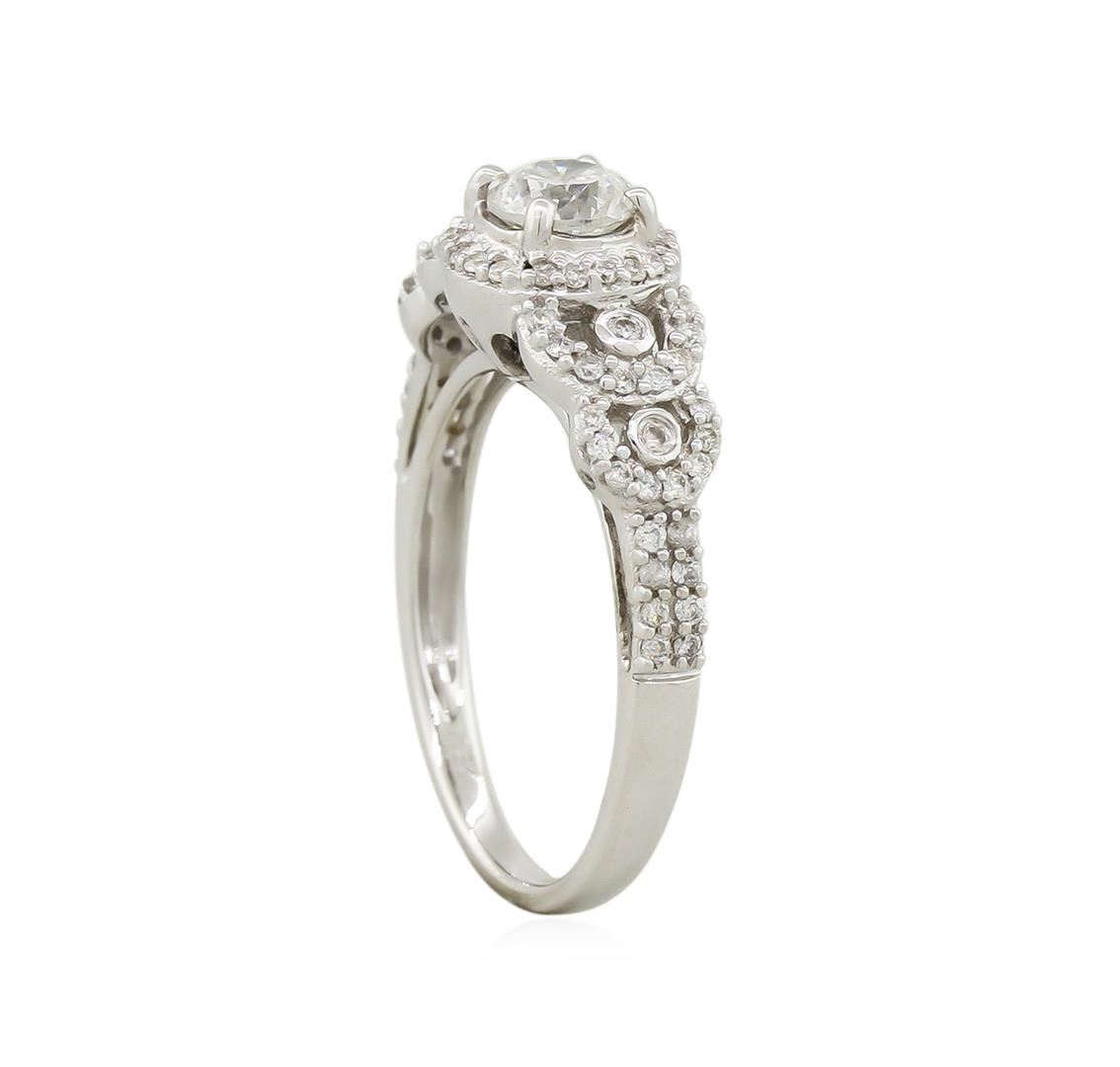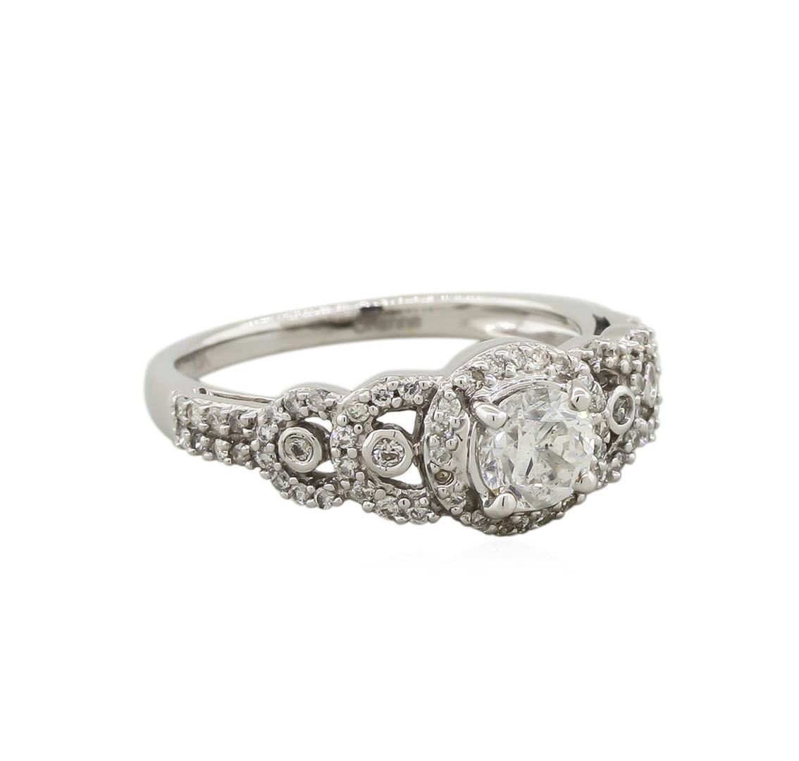 14KT white gold round brilliant cut diamond ring. A round brilliant cut diamond weighing in at an aproximate 0.60 carats is prong mounted in the center of the ring. Approximately 0.34 carats of round brilliant cut diamonds accent the ring around the center gemstones and on both sides. The ring is cast stamped "14K" and has a gross weight of 4.7 grams. The diamonds have an average clarity of I1, color G-J. Finish: High polish. Condition: Excellent GAS Appraised at $7,970.00.
