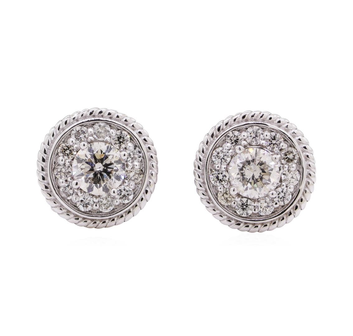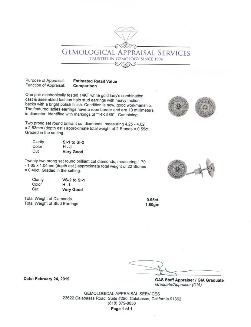 One pair electronically tested 14KT white gold lady's combination cast & assembled fashion halo stud earrings with heavy friction backs with a bright polish finish. The featured ladies earrings have a rope border and are 10 millimeters in diameter. Identified with markings of '14K 585'. Condition is new, good workmanship. Containing: Two prong set round brilliant cut diamonds, measuring 4.25 - 4.02 x 2.53mm (depth est.) approximate total weight of 2 Stones = 0.55ct. Graded in the setting. Color H - J, Clarity SI-1 to SI-2, Cut Very Good Twenty-Two prong set round brilliant cut diamonds, measuring 1.70 - 1.65 x 1.04mm (depth est.) approximate total weight of 22 Stones = 0.40ct. Graded in the setting. Color H - I, Clarity VS-2 to SI-1, Cut Very Good. Total Weight of Diamonds 0.95ct. Total Weight of Stud Earrings 1.80gm. GAS Appraised.