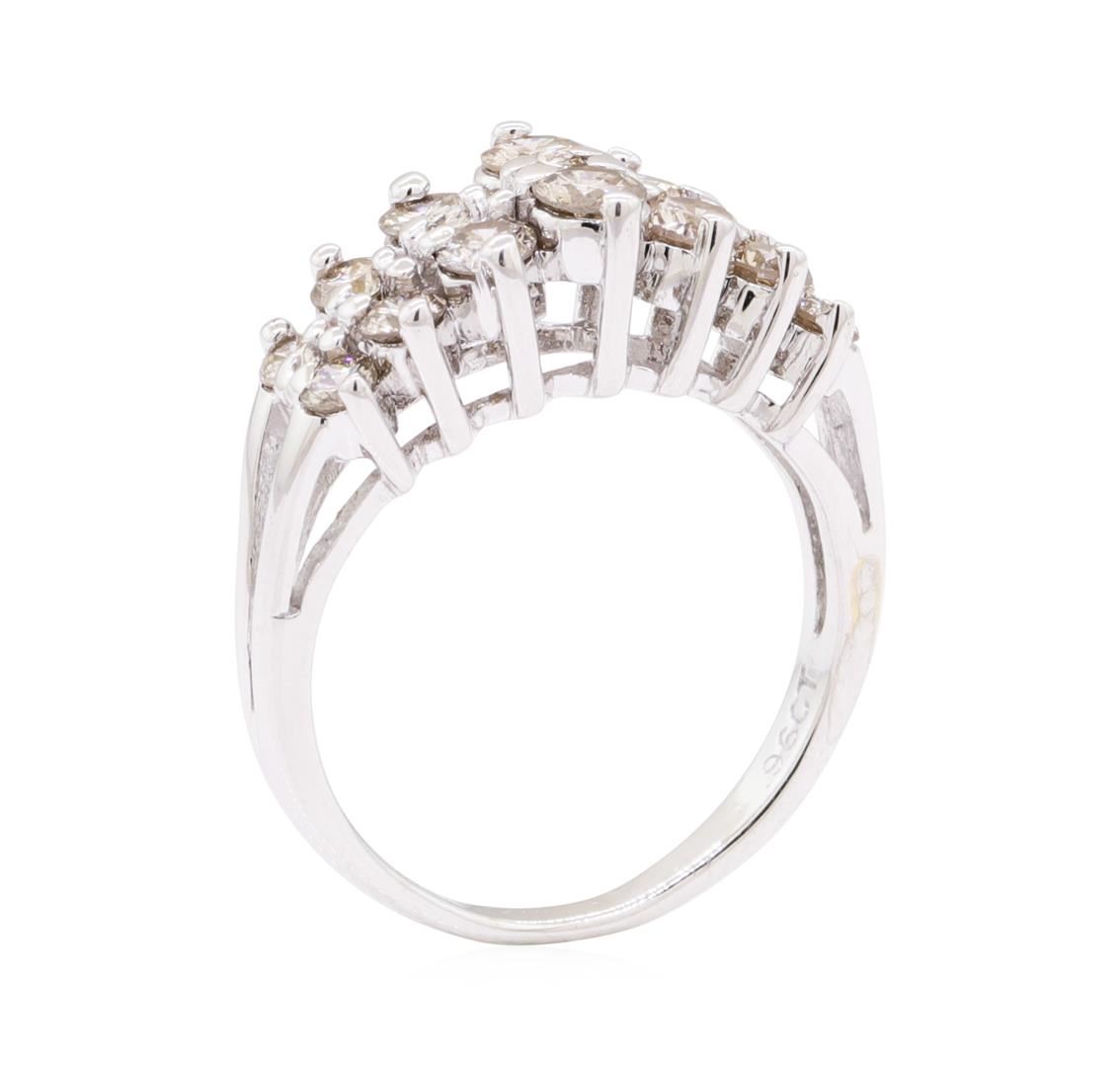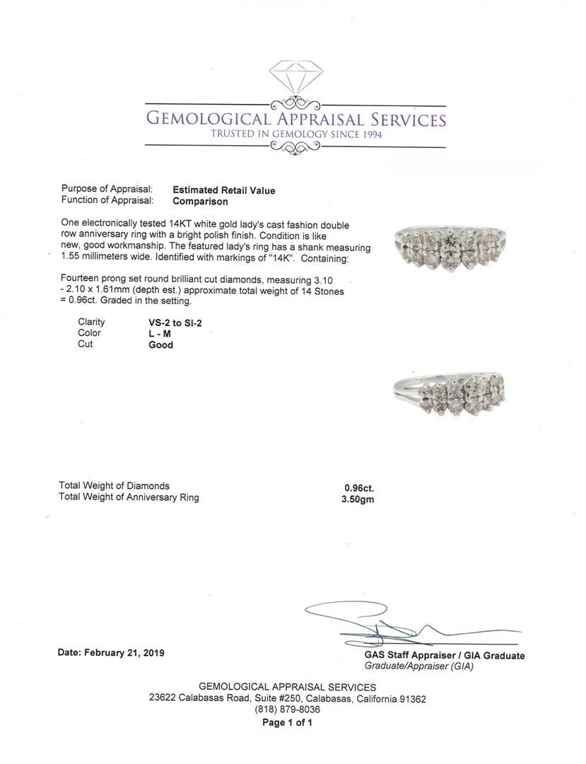 One electronically tested 14KT white gold lady's cast fashion double row anniversary ring with a bright polish finish. The featured lady's ring has a shank measuring 1.55 millimeters wide. Identified with markings of '14K'. Condition is like new, good workmanship. Containing: Fourteen prong set round brilliant cut diamonds, measuring 3.10 - 2.10 x 1.61mm (depth est.) approximate total weight of 14 Stones = 0.96ct. Graded in the setting. Color L - M, Clarity VS-2 to SI-2, Cut Good. Total Weight of Diamonds 0.96ct. Total Weight of Anniversary Ring 3.50gm. GAS Appraised.