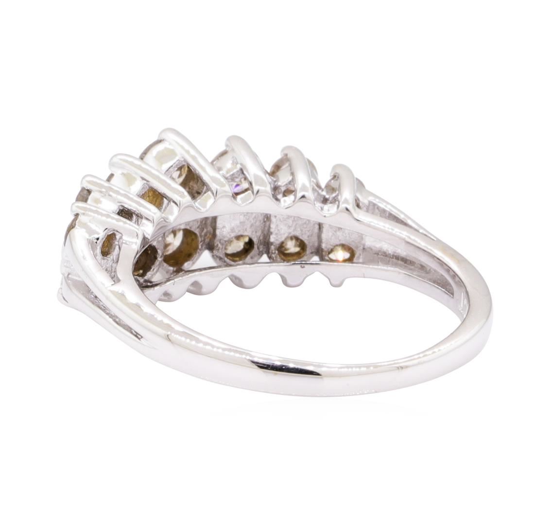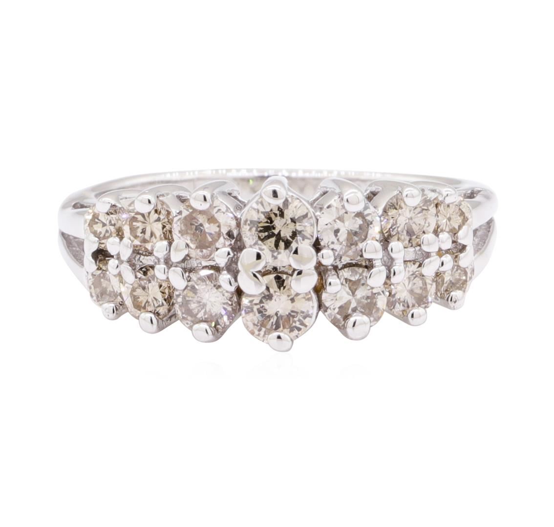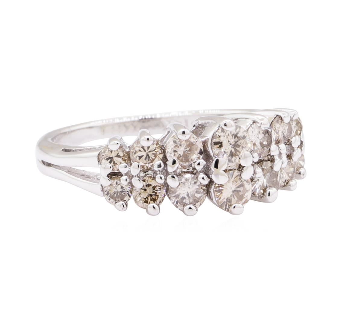 One electronically tested 14KT white gold lady's cast fashion double row anniversary ring with a bright polish finish. The featured lady's ring has a shank measuring 1.55 millimeters wide. Identified with markings of '14K'. Condition is like new, good workmanship. Containing: Fourteen prong set round brilliant cut diamonds, measuring 3.10 - 2.10 x 1.61mm (depth est.) approximate total weight of 14 Stones = 0.96ct. Graded in the setting. Color L - M, Clarity VS-2 to SI-2, Cut Good. Total Weight of Diamonds 0.96ct. Total Weight of Anniversary Ring 3.50gm. GAS Appraised.