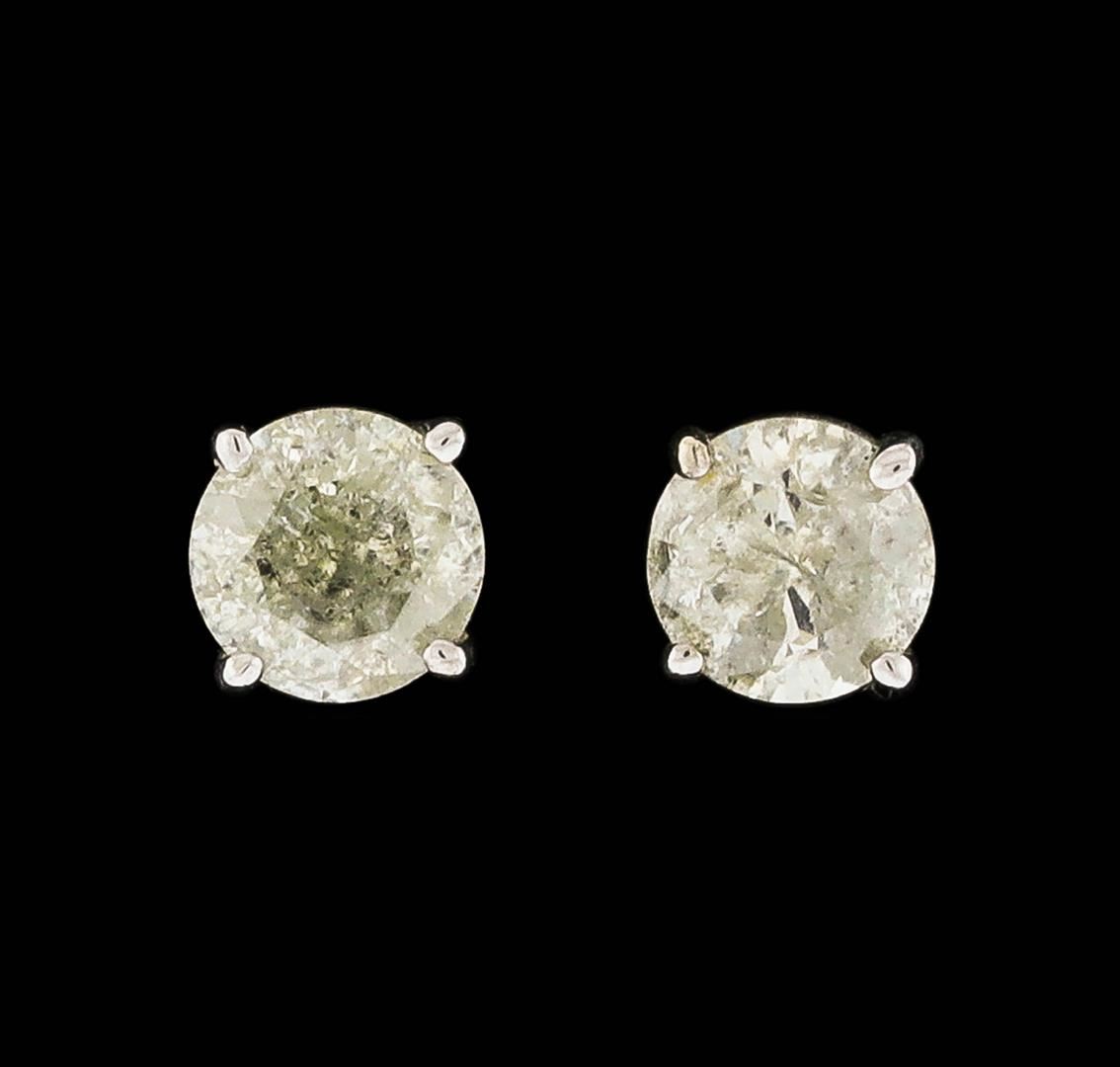 One pair electronically tested 14KT white gold cast & assembled diamond solitaire earrings with screw backs. Bright polish finish. Condition is new, good workmanship. Containing: One prong set round brilliant cut diamond, measuring 4.79 - 4.75 x 3.00mm (depth est.), 6.00.%. GTCF approximate weight of 0.46ct with a faint blue fluorescence. Graded in the setting. Clarity: I-2. Color: KDepth 62.9%. Table 56.6%. One prong set round brilliant cut diamond, measuring 4.95 - 4.90 x 3.20mm (depth est.), 6.00.%. GTCF approximate weight of 0.50ct with a medium blue fluorescence. Naturally occurring internal & external characteristics are present, including cavities. Graded in the setting. Clarity: I-3. Color: KDepth 64.9%. Table 57.8%. Total Weight of Diamonds 0.96ct. Total Weight of Earrings 0.60gm. AIG Appraised at $1,880.00.