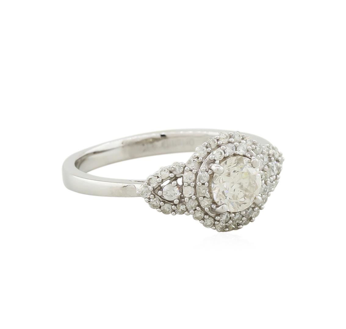 14KT white gold round brilliant cut diamond ring. A round brilliant cut diamond weighing in at an aproximate 0.62 carats is prong mounted in the center of the ring. Approximately 0.34 carats of round brilliant cut diamonds accent the ring around the center gemstones and on both sides. The ring is cast stamped "14K" and has a gross weight of 2.5 grams. The diamonds have an average clarity of I1, color H-J. Finish: High polish. Condition: Excellent GAS Appraised at $7,520.00.