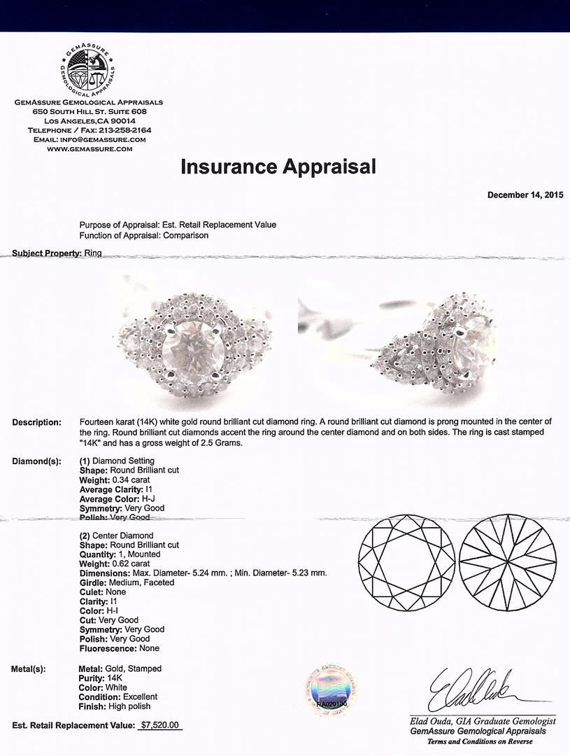 14KT white gold round brilliant cut diamond ring. A round brilliant cut diamond weighing in at an aproximate 0.62 carats is prong mounted in the center of the ring. Approximately 0.34 carats of round brilliant cut diamonds accent the ring around the center gemstones and on both sides. The ring is cast stamped "14K" and has a gross weight of 2.5 grams. The diamonds have an average clarity of I1, color H-J. Finish: High polish. Condition: Excellent GAS Appraised at $7,520.00.