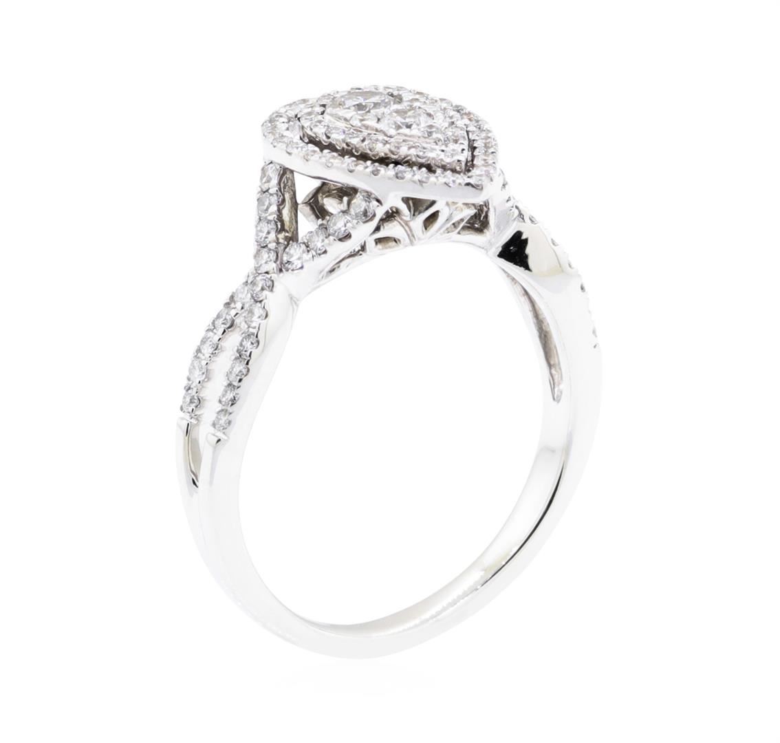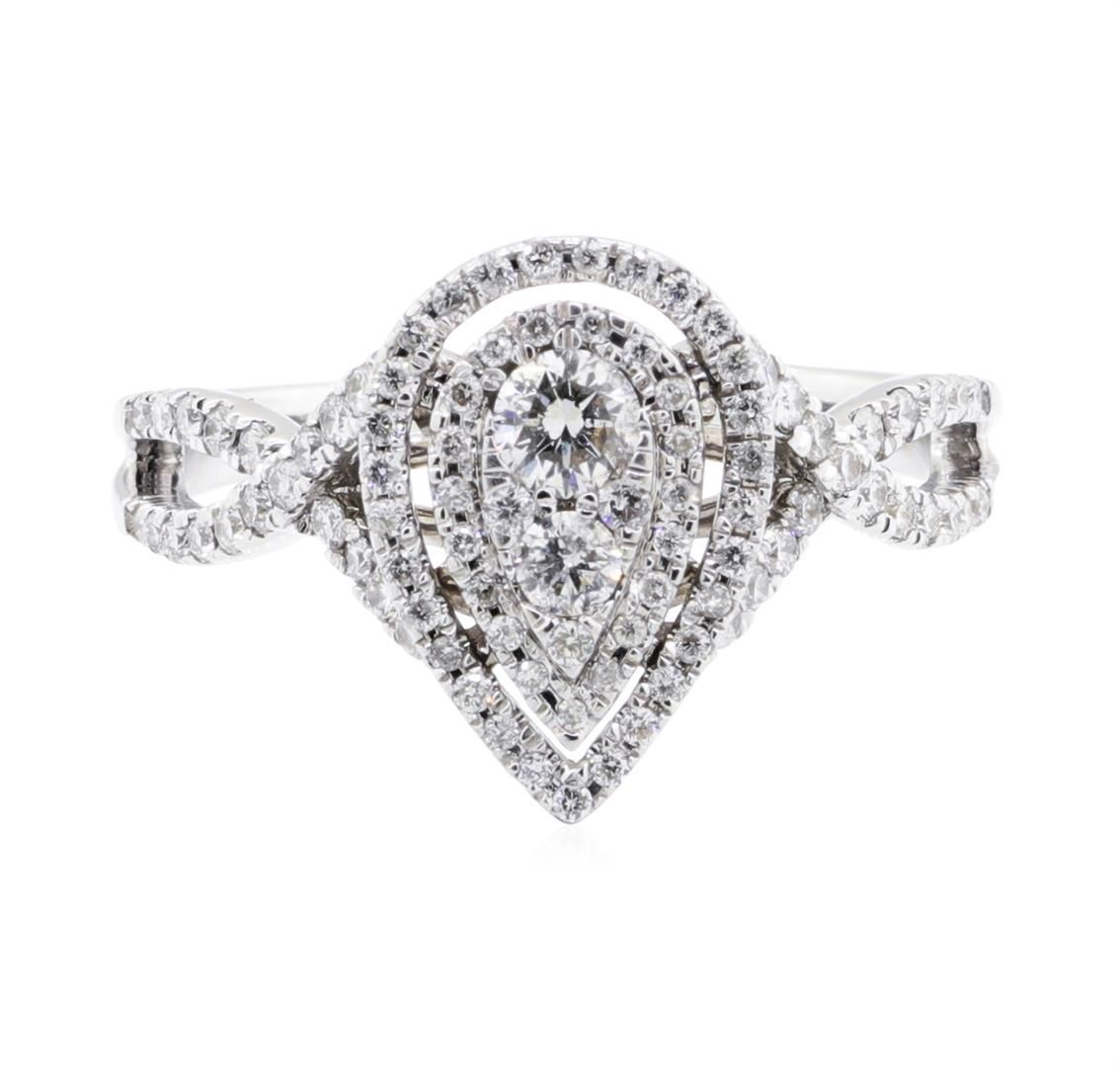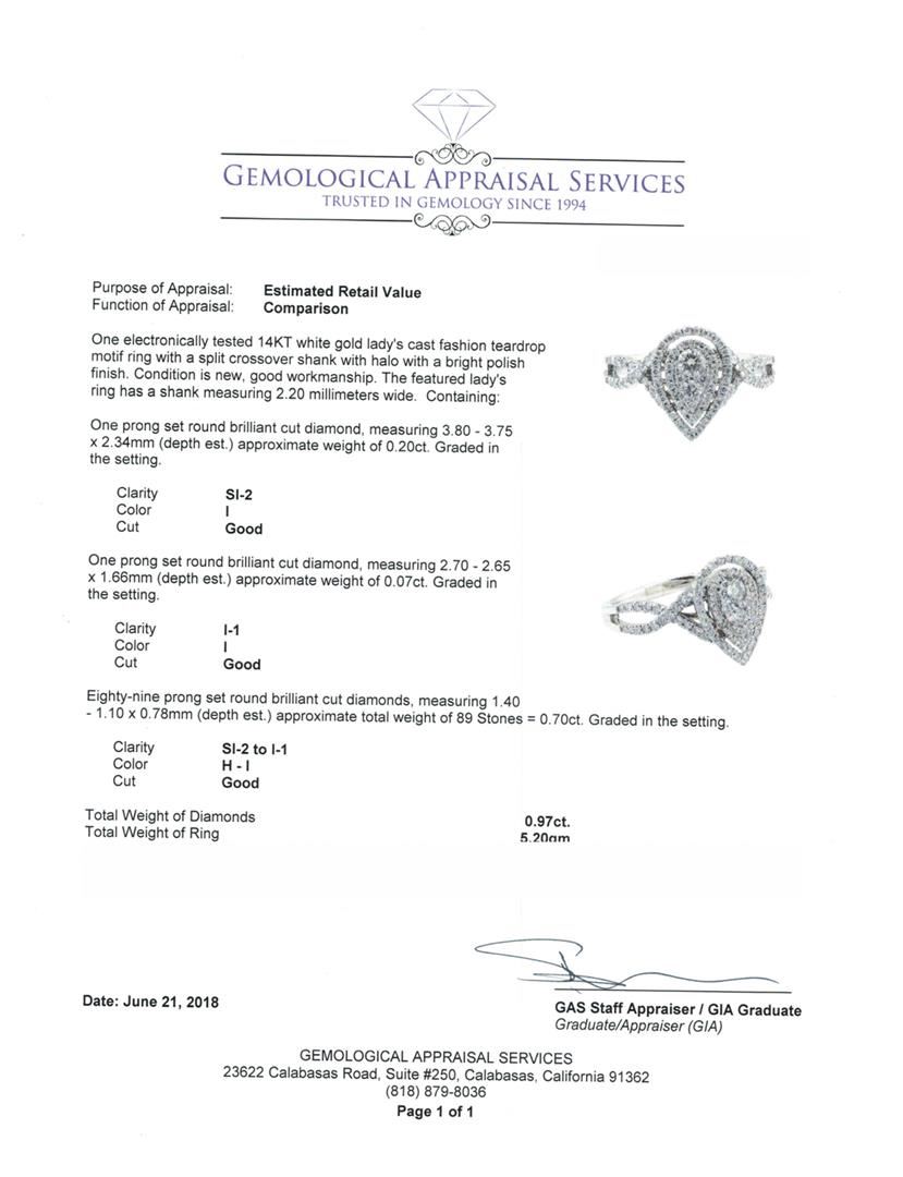 One electronically tested 14KT white gold lady's cast fashion teardrop motif ring with a split crossover shank with halo with a bright polish finish. The featured lady's ring has a shank measuring 2.20 millimeters wide. Condition is new, good workmanship. Containing: One prong set round brilliant cut diamond, measuring 3.80 - 3.75 x 2.34mm (depth est.) approximate weight of 0.20ct. Graded in the setting. Color I Clarity SI-2 Cut Good One prong set round brilliant cut diamond, measuring 2.70 - 2.65 x 1.66mm (depth est.) approximate weight of 0.07ct. Graded in the setting. Color I Clarity I-1 Cut Good Eighty-Nine prong set round brilliant cut diamonds, measuring 1.40 - 1.10 x 0.78mm (depth est.) approximate total weight of 89 Stones = 0.70ct. Graded in the setting. Color H - I Clarity SI-2 to I-1 Cut Good. Total Weight of Diamonds 0.97ct. Total Weight of Ring 5.20gm. GAS Appraised.