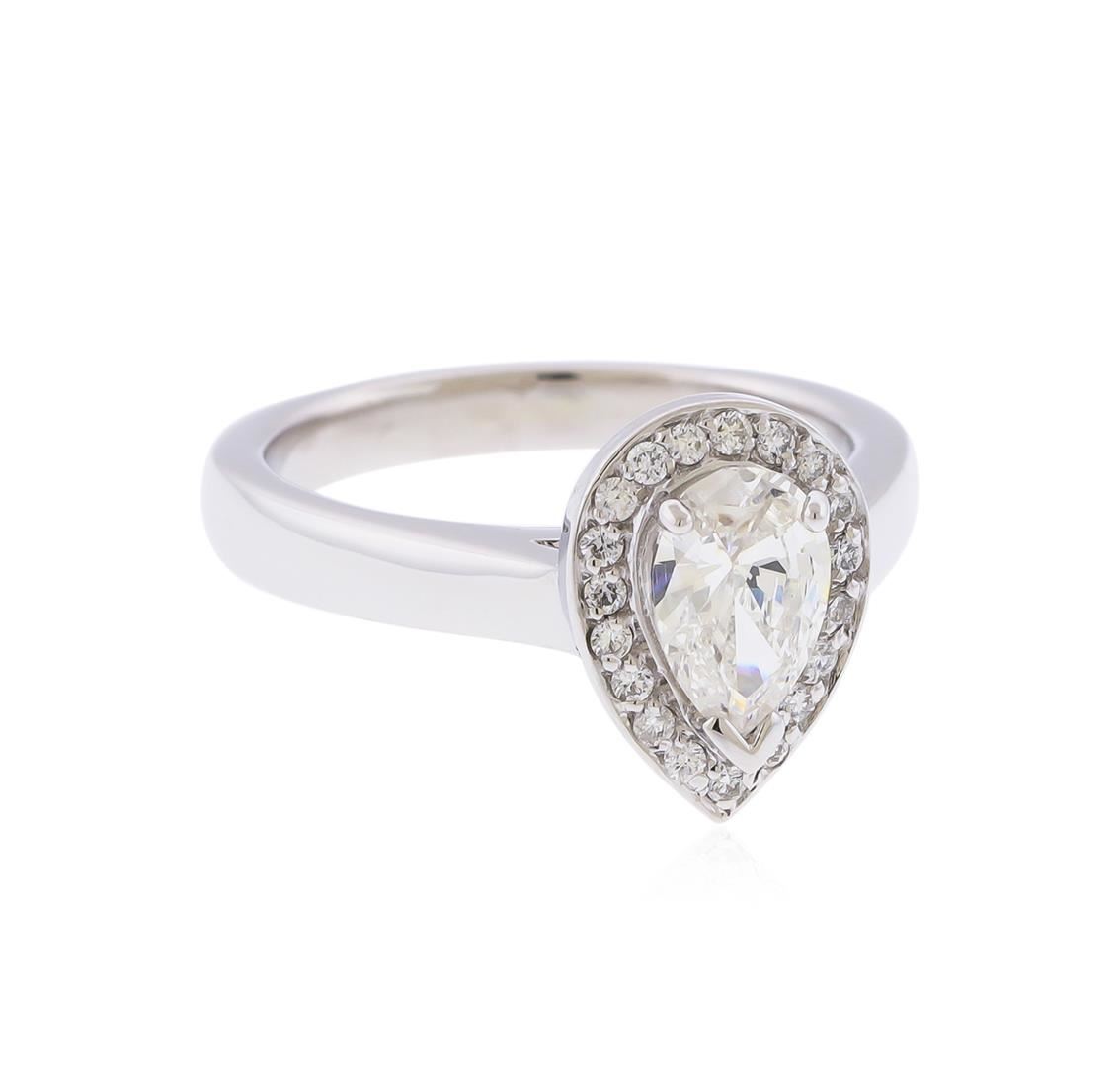 Containing 14K White Gold Ring weighing approximately 4.78 grams. (1) Pear Shaped Diamond weighing approximately .85cts, Clarity: SI-2, Color G-H; Surrounded by diamonds weighing approximately .12ctw, Clarity: SI Clarity, Color: G-H. RBGS Appraised.