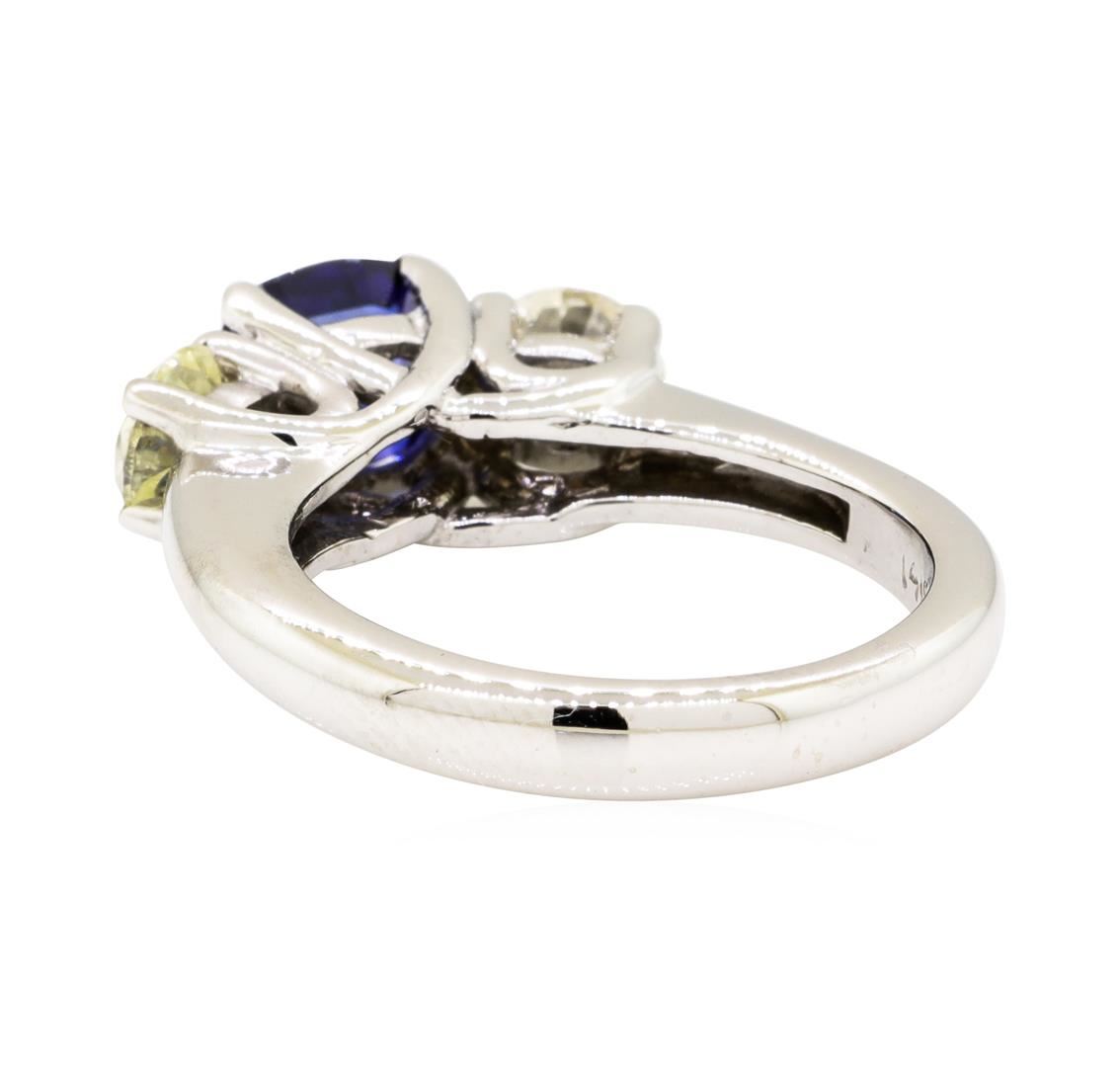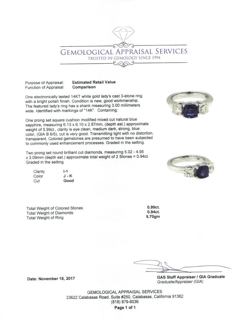 One electronically tested 14KT white gold lady's cast 3-stone ring with a bright polish finish. The featured lady's ring has a shank measuring 3.00 millimeters wide. Identified with markings of '14K'. Condition is new, good workmanship. Containing: One prong set square cushion modified mixed cut natural blue sapphire, measuring 6.13 x 6.10 x 2.87mm, (depth est.) approximate weight of 0.99ct., clarity is eye clean, medium dark, strong, blue color, (GIA B 6/5), cut is very good. Transmitting light with no distortion, transparent. Colored gemstones are presumed to have been subjected to commonly used enhancement processes. Graded in the setting. Two prong set round brilliant cut diamonds, measuring 5.02 - 4.95 x 3.09mm (depth est.) approximate total weight of 2 Stones = 0.94ct. Graded in the setting. Color J - K Clarity I-1 Cut Good. Total Weight of Colored Stones 0.99ct.. Total Weight of Diamonds 0.94ct.. Total Weight of Ring 5.70gm. GAS Appraised.