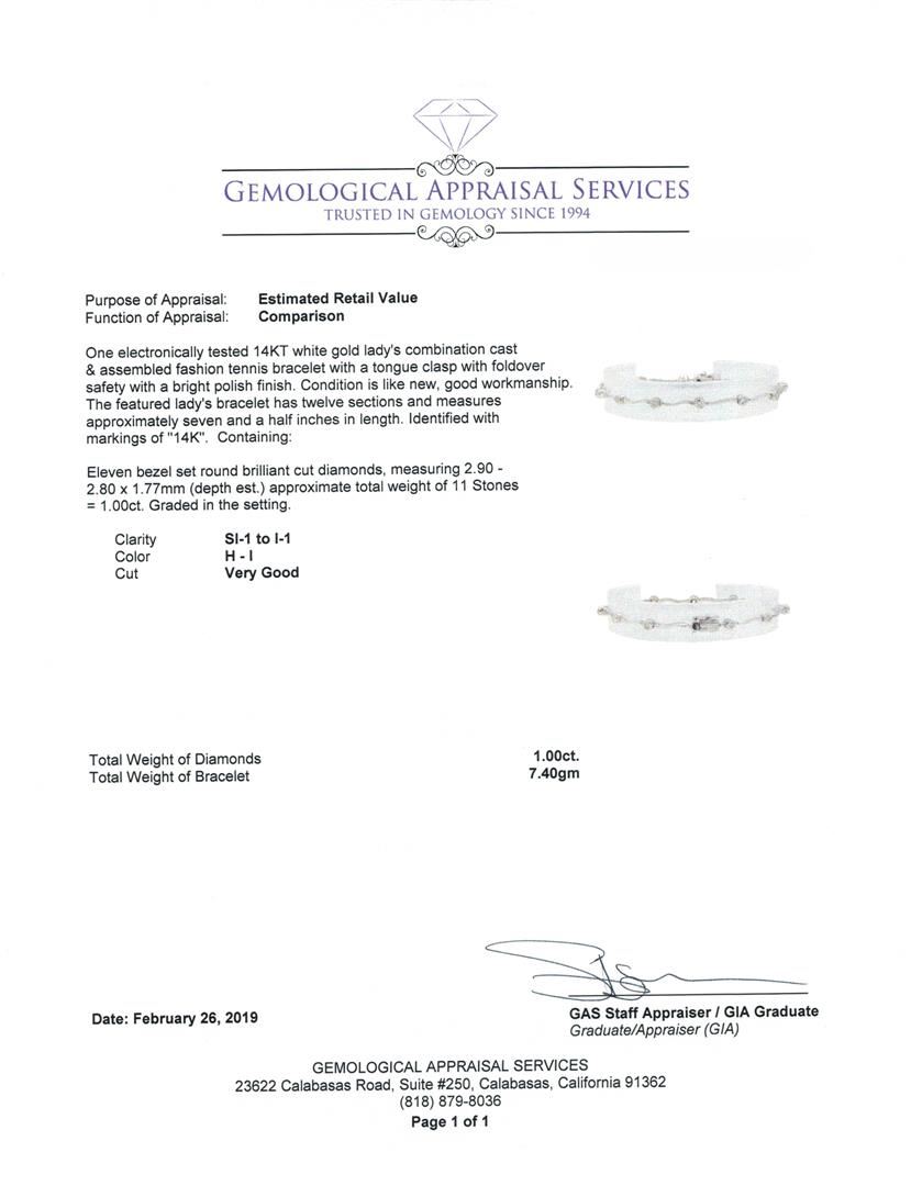 One electronically tested 14KT white gold lady's combination cast & assembled fashion tennis bracelet with a tongue clasp with foldover safety with a bright polish finish. The featured lady's bracelet has twelve sections and measures approximately seven and a half inches in length. Identified with markings of '14K'. Condition is like new, good workmanship. Containing: Eleven bezel set round brilliant cut diamonds, measuring 2.90 - 2.80 x 1.77mm (depth est.) approximate total weight of 11 Stones = 1.00ct. Graded in the setting. Color H - I, Clarity SI-1 to I-1, Cut Very Good. Total Weight of Diamonds 1.00ct. Total Weight of Bracelet 7.40gm. GAS Appraised.