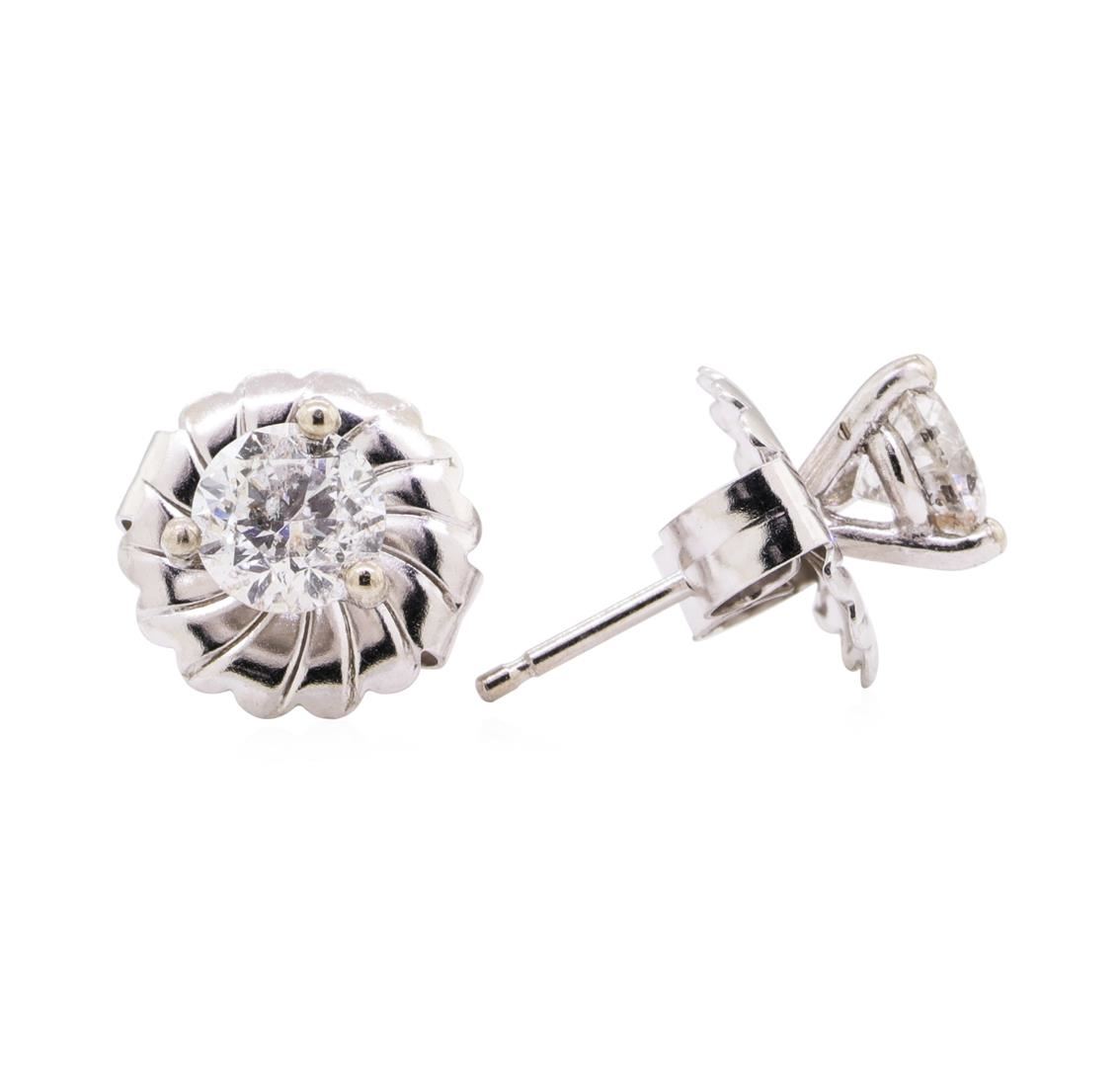 One pair electronically tested 14KT white gold lady's combination cast & assembled fashion three prong stud earrings with heavy friction backs with a bright polish finish. Identified with markings of '14K'. Condition is new, good workmanship. Containing: Two prong set round brilliant cut diamonds, measuring 5.02 - 4.96 x 3.14mm (depth est.) , 5.00.%. GTCF approximate total weight of 2 Stones = 1.00ct. Graded in the setting. Color G - H, Clarity I-1, Cut Very Good. Total Weight of Diamonds 1.00ct. Total Weight of Earrings 1.50gm. GAS Appraised.