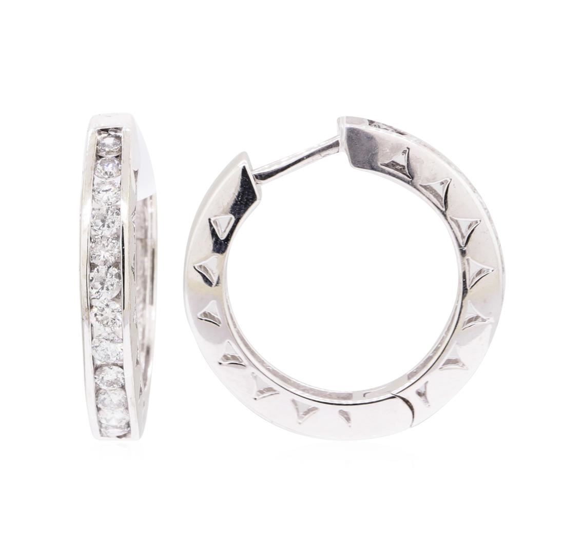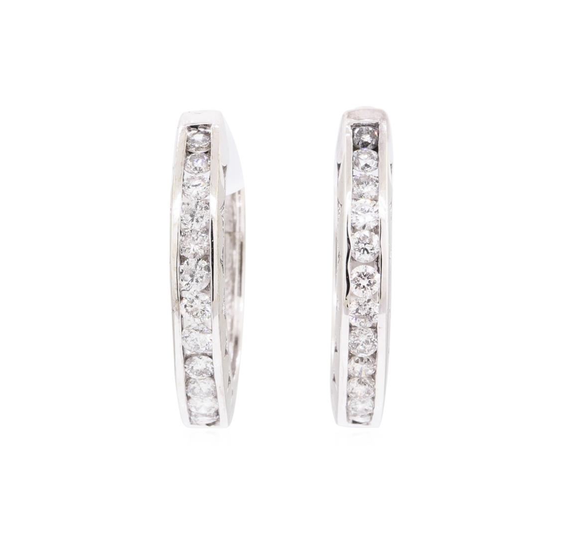 One pair electronically tested 14KT white gold lady's combination cast & assembled fashion hoop earrings with hinged, snap locking posts with a bright polish finish. Condition is new, good workmanship. Containing: Twenty-Four channel set round brilliant cut diamonds, measuring 2.25 - 2.20 x 1.38mm (depth est.) approximate total weight of 24 Stones = 1.00ct. Graded in the setting. Color I - J, Clarity SI-2 to I-1, Cut Good. Total Weight of Diamonds 1.00ct. Total Weight of Earrings 7.60gm. GAS Appraised.