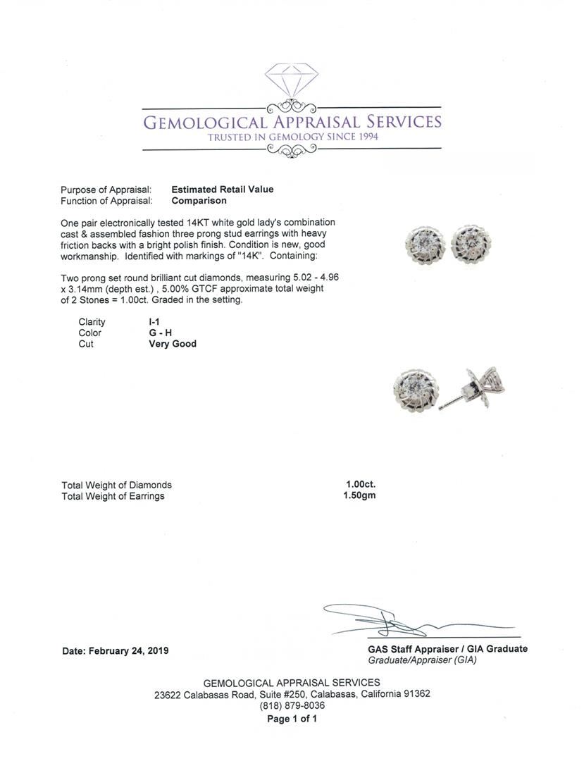One pair electronically tested 14KT white gold lady's combination cast & assembled fashion three prong stud earrings with heavy friction backs with a bright polish finish. Identified with markings of '14K'. Condition is new, good workmanship. Containing: Two prong set round brilliant cut diamonds, measuring 5.02 - 4.96 x 3.14mm (depth est.) , 5.00.%. GTCF approximate total weight of 2 Stones = 1.00ct. Graded in the setting. Color G - H, Clarity I-1, Cut Very Good. Total Weight of Diamonds 1.00ct. Total Weight of Earrings 1.50gm. GAS Appraised.