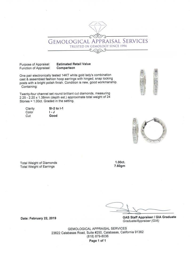 One pair electronically tested 14KT white gold lady's combination cast & assembled fashion hoop earrings with hinged, snap locking posts with a bright polish finish. Condition is new, good workmanship. Containing: Twenty-Four channel set round brilliant cut diamonds, measuring 2.25 - 2.20 x 1.38mm (depth est.) approximate total weight of 24 Stones = 1.00ct. Graded in the setting. Color I - J, Clarity SI-2 to I-1, Cut Good. Total Weight of Diamonds 1.00ct. Total Weight of Earrings 7.60gm. GAS Appraised.