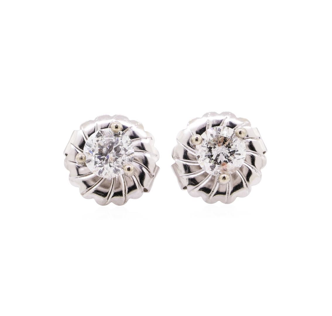 One pair electronically tested 14KT white gold lady's combination cast & assembled fashion three prong stud earrings with heavy friction backs with a bright polish finish. Identified with markings of '14K'. Condition is new, good workmanship. Containing: Two prong set round brilliant cut diamonds, measuring 5.02 - 4.96 x 3.14mm (depth est.) , 5.00.%. GTCF approximate total weight of 2 Stones = 1.00ct. Graded in the setting. Color G - H, Clarity I-1, Cut Very Good. Total Weight of Diamonds 1.00ct. Total Weight of Earrings 1.50gm. GAS Appraised.