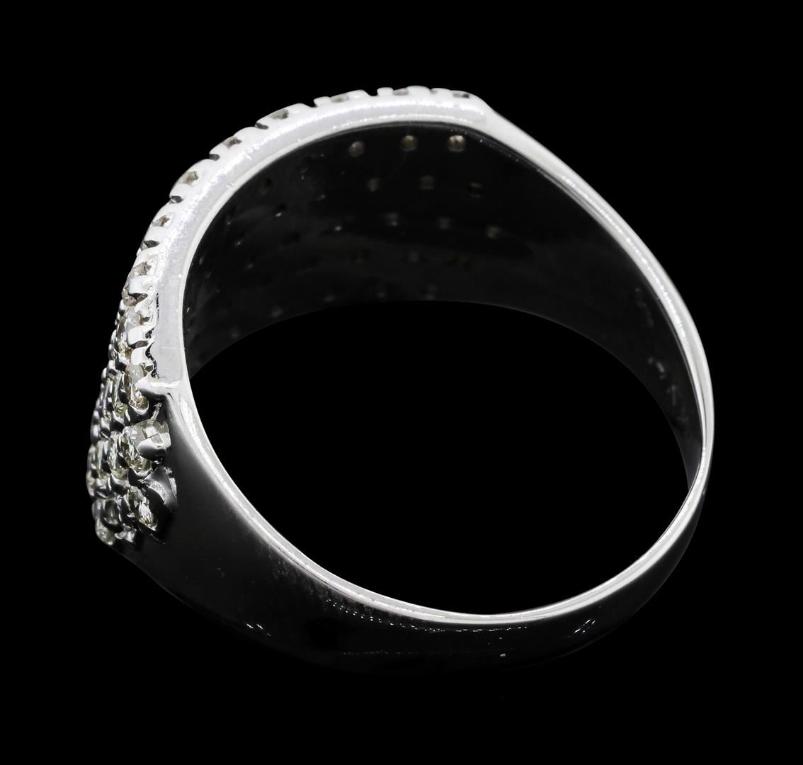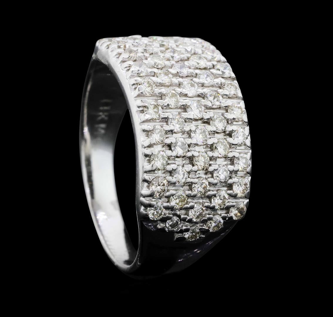 One electronically tested 14KT white gold lady's cast fashion ring with a tapered wide band with a bright polish finish. The featured lady's ring has a shank measuring 2.85 millimeters wide. Identified with markings of "14K". Condition is like new, good workmanship. Containing: Fifty-Four prong set round brilliant cut diamonds, measuring 1.70 - 1.65 x 1.04mm (depth est.) approximate total weight of 54 Stones = 1.00ct. Graded in the setting. Color I - JClarity SI-1 to SI-2 Cut Good. Total Weight of Diamonds 1.00ct. Total Weight of Ring 6.30gm. GAS Appraised.