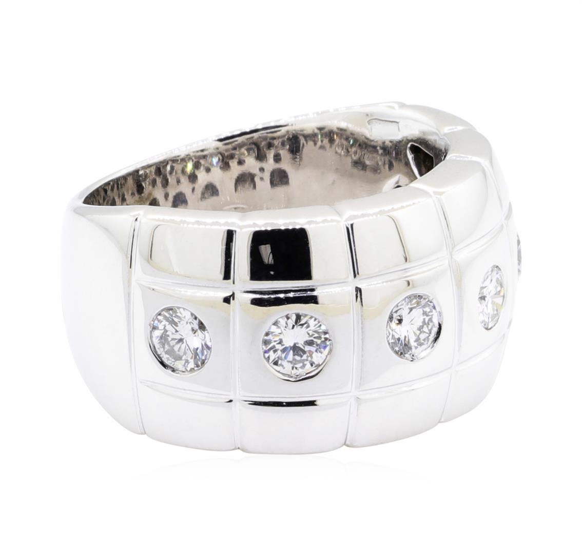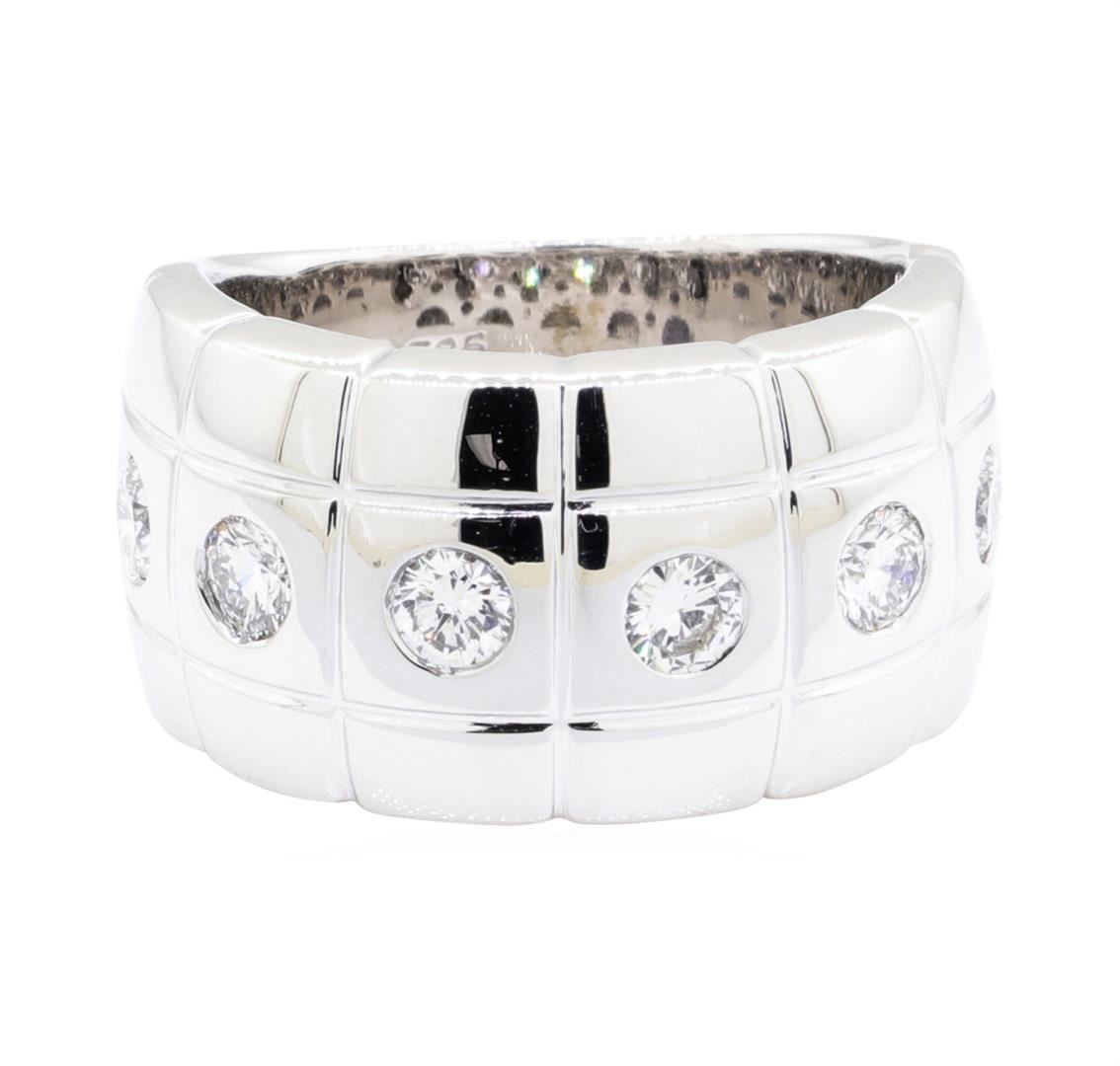 One electronically tested 14KT white gold lady's cast fashion ring with a wide band with a bright polish finish. The featured lady's ring has a shank measuring 6.40 millimeters wide. Identified with markings of '585'. Condition is new, good workmanship. Containing: Six bezel set round brilliant cut diamonds, measuring 3.60 - 3.50 x 2.20mm (depth est.) approximate total weight of 6 Stones = 1.00ct. Graded in the setting. Color G - H Clarity VS-1 to VS-2 Cut Very Good. Total Weight of Diamonds 1.00ct. Total Weight of Ring 12.90gm. GAS Appraised.