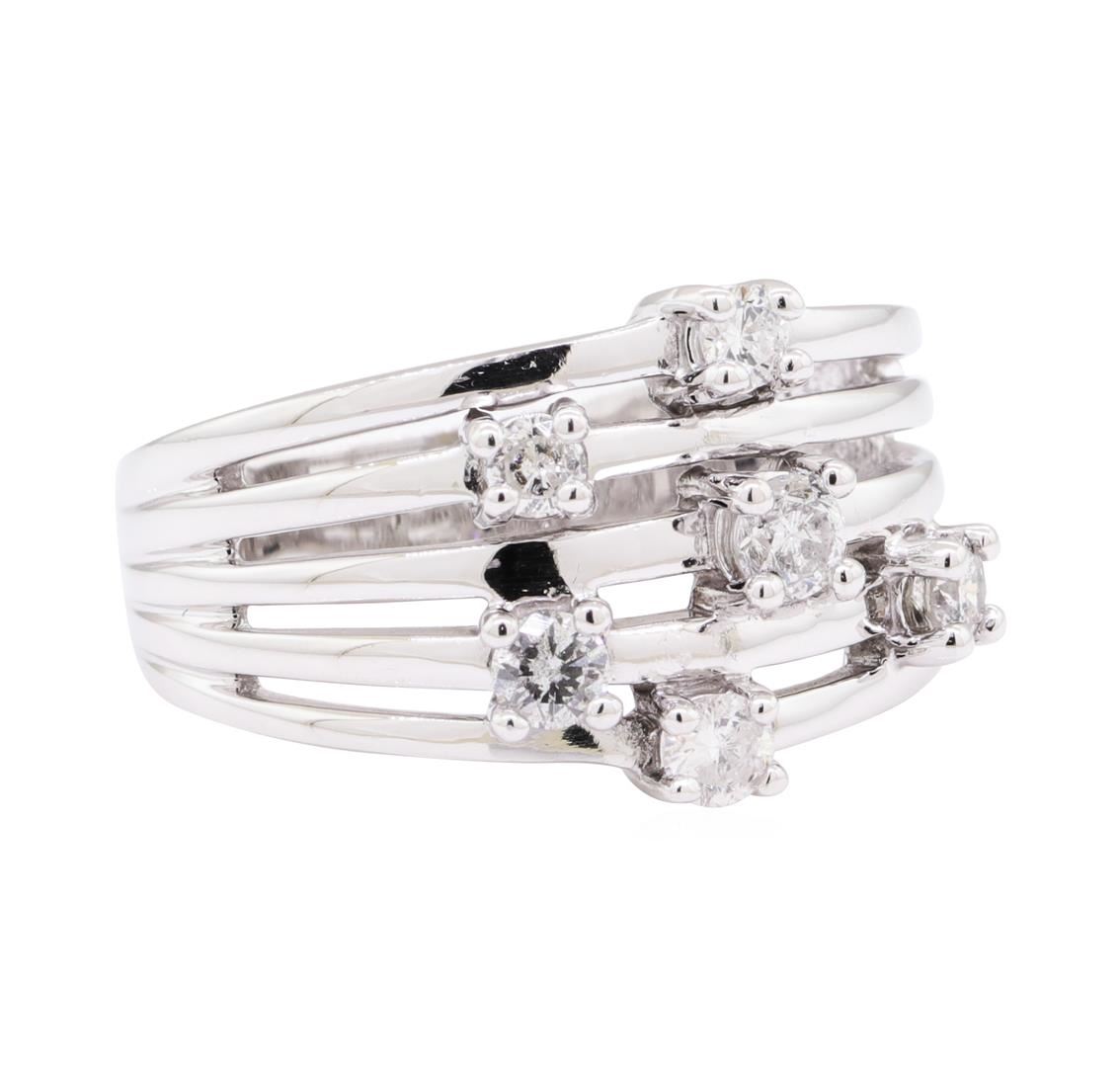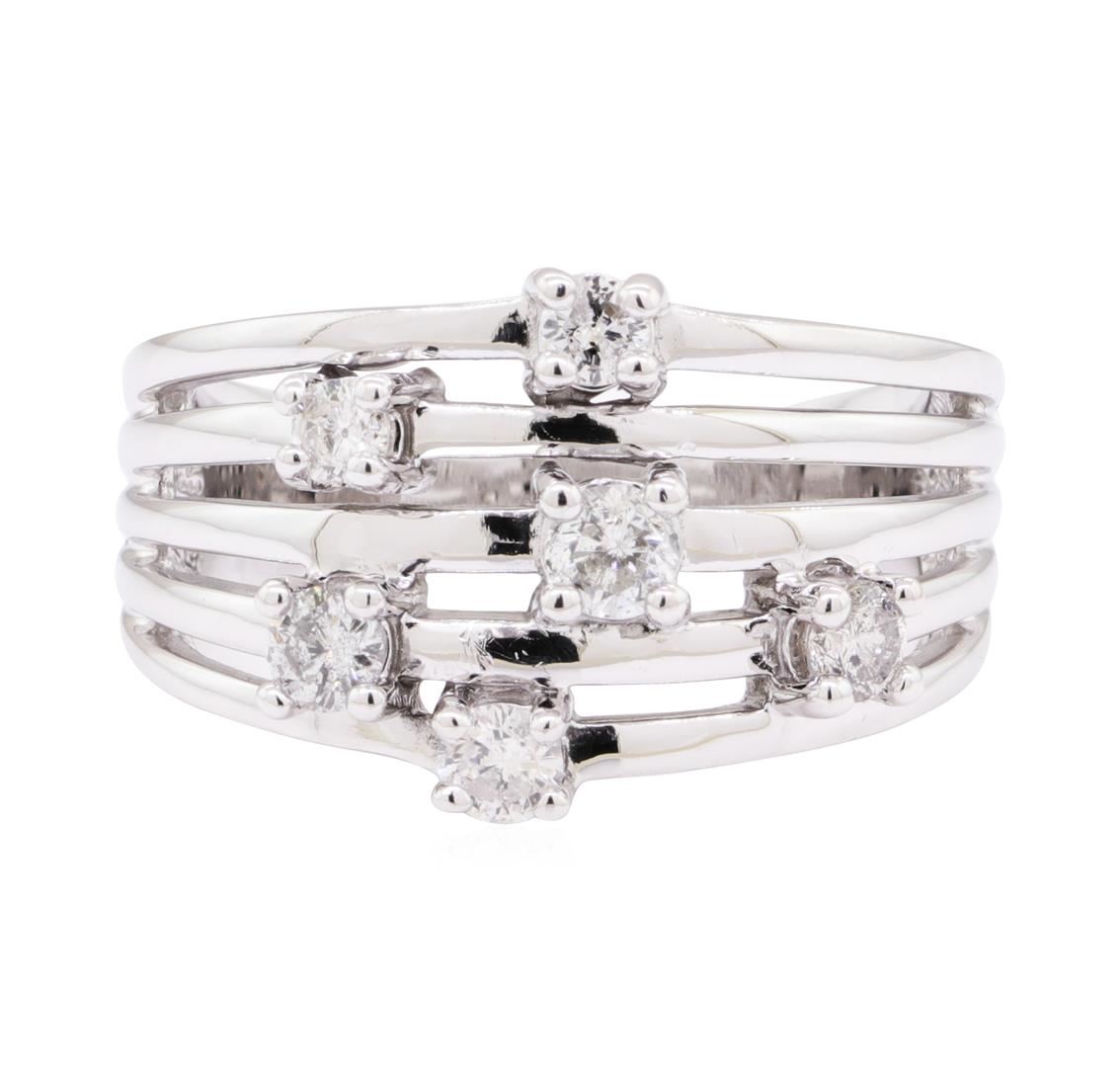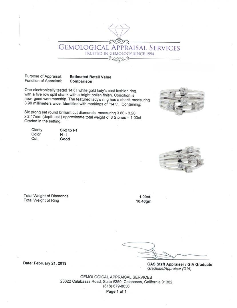One electronically tested 14KT white gold lady's cast fashion ring with a five row split shank with a bright polish finish. The featured lady's ring has a shank measuring 3.90 millimeters wide. Identified with markings of '14K'. Condition is new, good workmanship. Containing: Six prong set round brilliant cut diamonds, measuring 3.80 - 3.20 x 2.17mm (depth est.) approximate total weight of 6 Stones = 1.00ct. Graded in the setting. Color H - I, Clarity SI-2 to I-1, Cut Good. Total Weight of Diamonds 1.00ct. Total Weight of Ring 10.40gm. GAS Appraised.