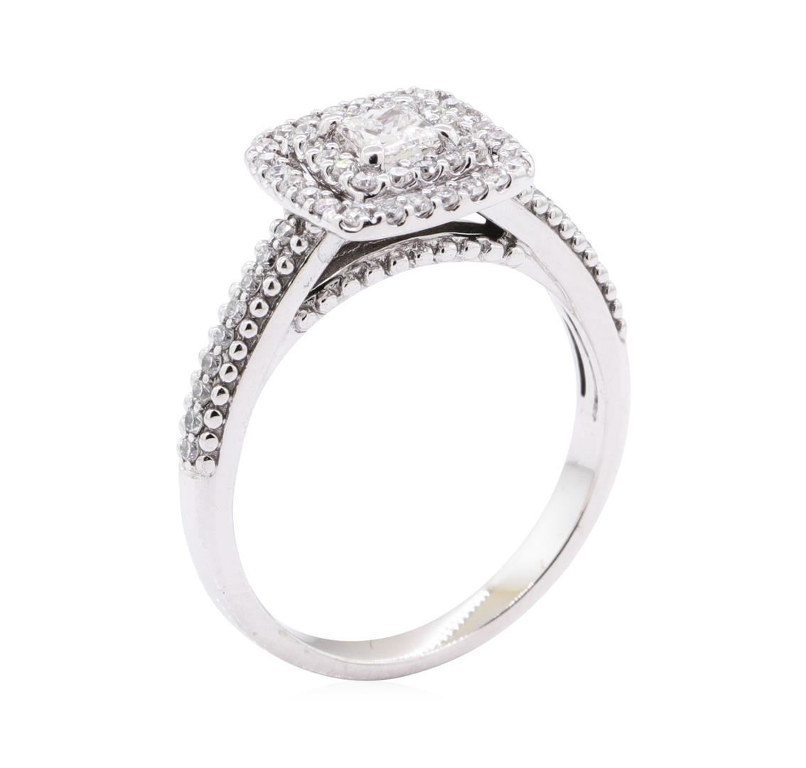 One halo wedding ring featuring: 14KT white gold weighing 5.3 grams containing diamonds weighing 1.00ctw. The ring is a size 6.5