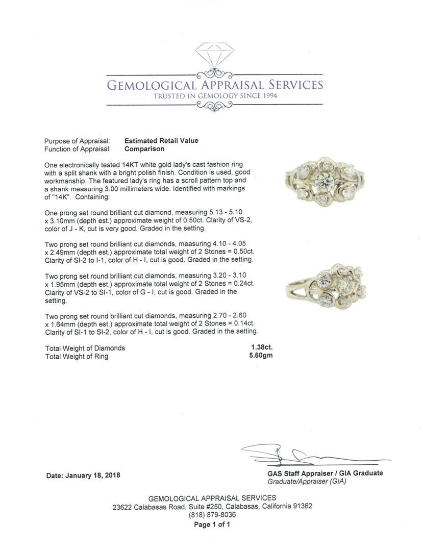One electronically tested 14KT white gold ladies cast fashion ring with a split shank with a bright polish finish. The featured ladies ring has a scroll pattern top and a shank measuring 3.00 millimeters wide. Identified with markings of '14K'. Condition is used, good workmanship. Containing: One prong set round brilliant cut diamond, measuring 5.13 - 5.10 x 3.10mm (depth est.) approximate weight of 0.50ct. Graded in the setting. Color J - K Clarity VS-2 Cut Very Good Two prong set round brilliant cut diamonds, measuring 4.10 - 4.05 x 2.49mm (depth est.) approximate total weight of 2 Stones = 0.50ct. Graded in the setting. Color H - I Clarity SI-2 to I-1 Cut Good Two prong set round brilliant cut diamonds, measuring 3.20 - 3.10 x 1.95mm (depth est.) approximate total weight of 2 Stones = 0.24ct. Graded in the setting. Color G - I Clarity VS-2 to SI-1 Cut Good Two prong set round brilliant cut diamonds, measuring 2.70 - 2.60 x 1.64mm (depth est.) approximate total weight of 2 Stones = 0.14ct. Graded in the setting. Color H - I Clarity SI-1 to SI-2 Cut Good. Total Weight of Diamonds 1.38ct. Total Weight of Ring 5.60gm. GAS Appraised.