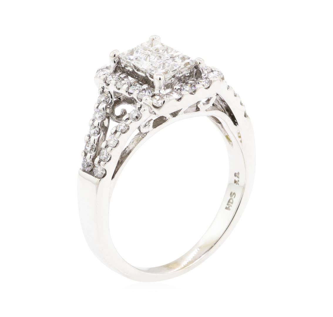 One electronically tested 14KT white gold lady's cast fashion ring with a split shank halo with a bright polish finish. The featured lady's ring has a shank measuring 2.30 millimeters wide. Identified with markings of '14K'. Condition is new, good workmanship. Containing: Six invisible set princess cut diamonds, measuring 2.30 x 2.25 x 1.69mm (depth est.) approximate total weight of 6 Stones = 0.45ct. Graded in the setting. Color H - I Clarity SI-2 to I-1 Cut Good Thirty-Eight prong set round brilliant cut diamonds, measuring 1.60 - 1.50 x 0.96mm (depth est.) approximate total weight of 38 Stones = 0.55ct. Graded in the setting. Color H - I Clarity SI-1 to SI-2 Cut Good. Total Weight of Diamonds 1.00ct. Total Weight of Ring 4.40gm. GAS Appraised.