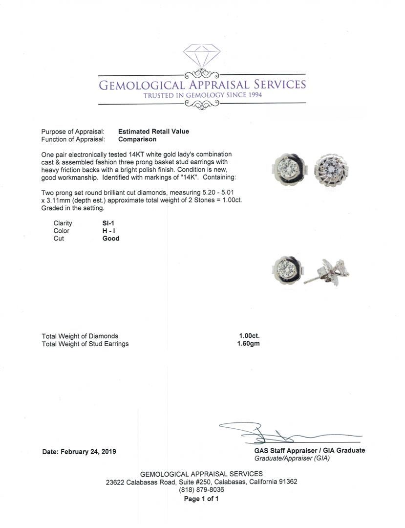 One pair electronically tested 14KT white gold lady's combination cast & assembled fashion three prong basket stud earrings with heavy friction backs with a bright polish finish. Identified with markings of '14K'. Condition is new, good workmanship. Containing: Two prong set round brilliant cut diamonds, measuring 5.20 - 5.01 x 3.11mm (depth est.) approximate total weight of 2 Stones = 1.00ct. Graded in the setting. Color H - I, Clarity SI-1, Cut Good. Total Weight of Diamonds 1.00ct. Total Weight of Stud Earrings 1.60gm. GAS Appraised.