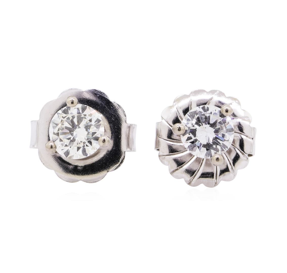 One pair electronically tested 14KT white gold lady's combination cast & assembled fashion three prong basket stud earrings with heavy friction backs with a bright polish finish. Identified with markings of '14K'. Condition is new, good workmanship. Containing: Two prong set round brilliant cut diamonds, measuring 5.20 - 5.01 x 3.11mm (depth est.) approximate total weight of 2 Stones = 1.00ct. Graded in the setting. Color H - I, Clarity SI-1, Cut Good. Total Weight of Diamonds 1.00ct. Total Weight of Stud Earrings 1.60gm. GAS Appraised.