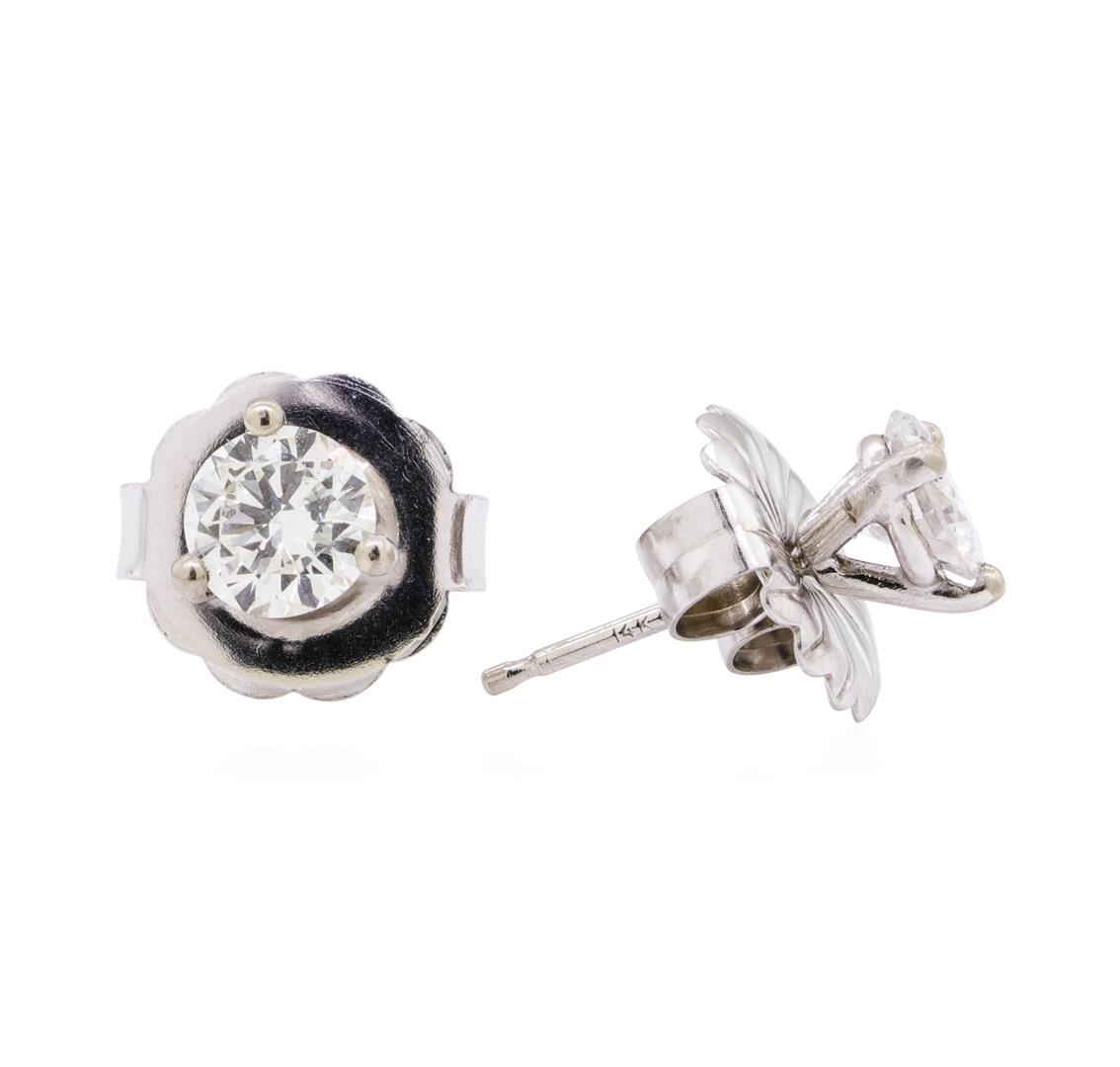 One pair electronically tested 14KT white gold lady's combination cast & assembled fashion three prong basket stud earrings with heavy friction backs with a bright polish finish. Identified with markings of '14K'. Condition is new, good workmanship. Containing: Two prong set round brilliant cut diamonds, measuring 5.20 - 5.01 x 3.11mm (depth est.) approximate total weight of 2 Stones = 1.00ct. Graded in the setting. Color H - I, Clarity SI-1, Cut Good. Total Weight of Diamonds 1.00ct. Total Weight of Stud Earrings 1.60gm. GAS Appraised.