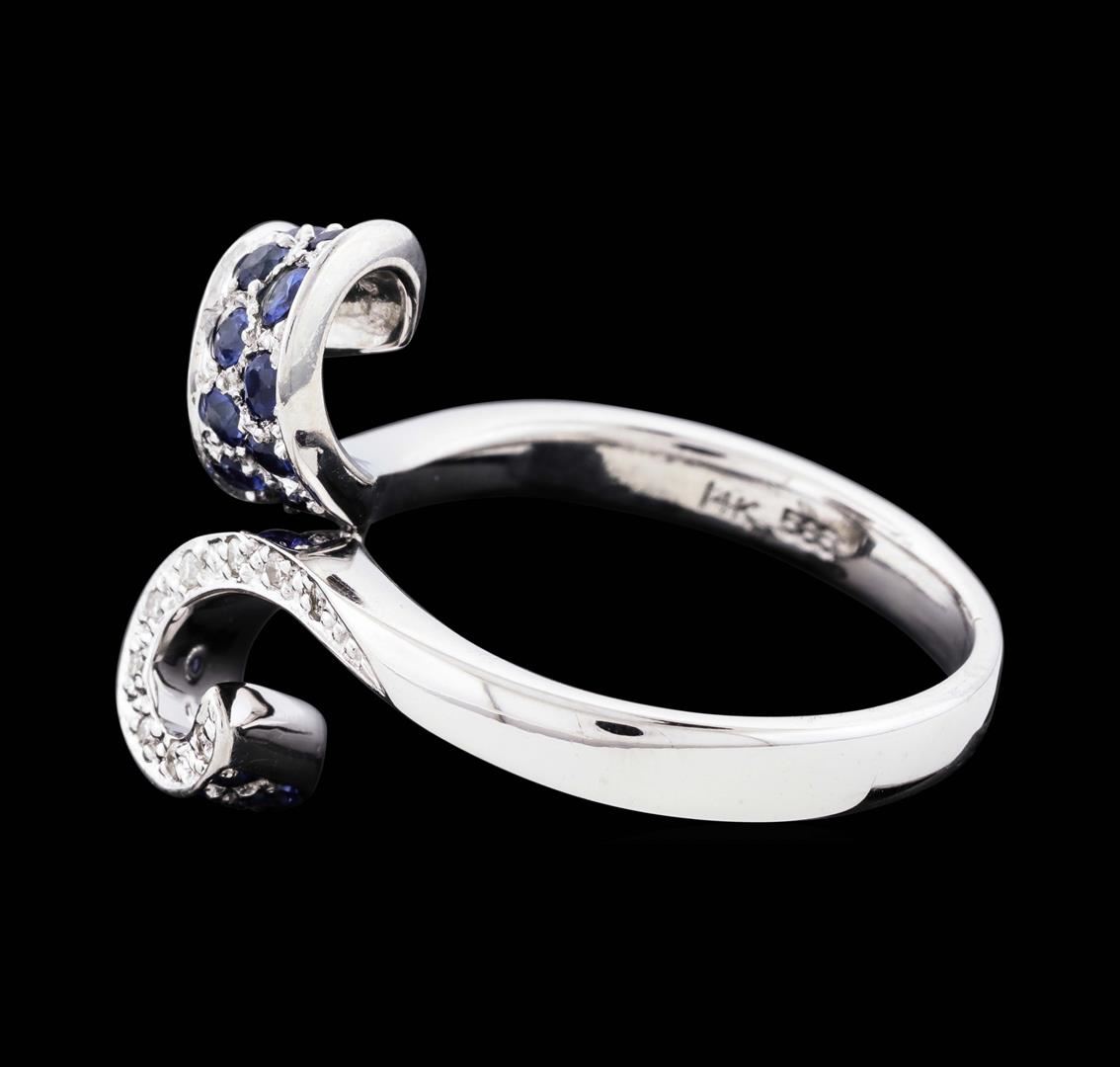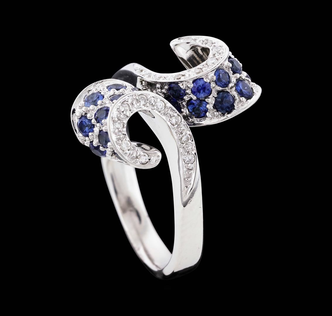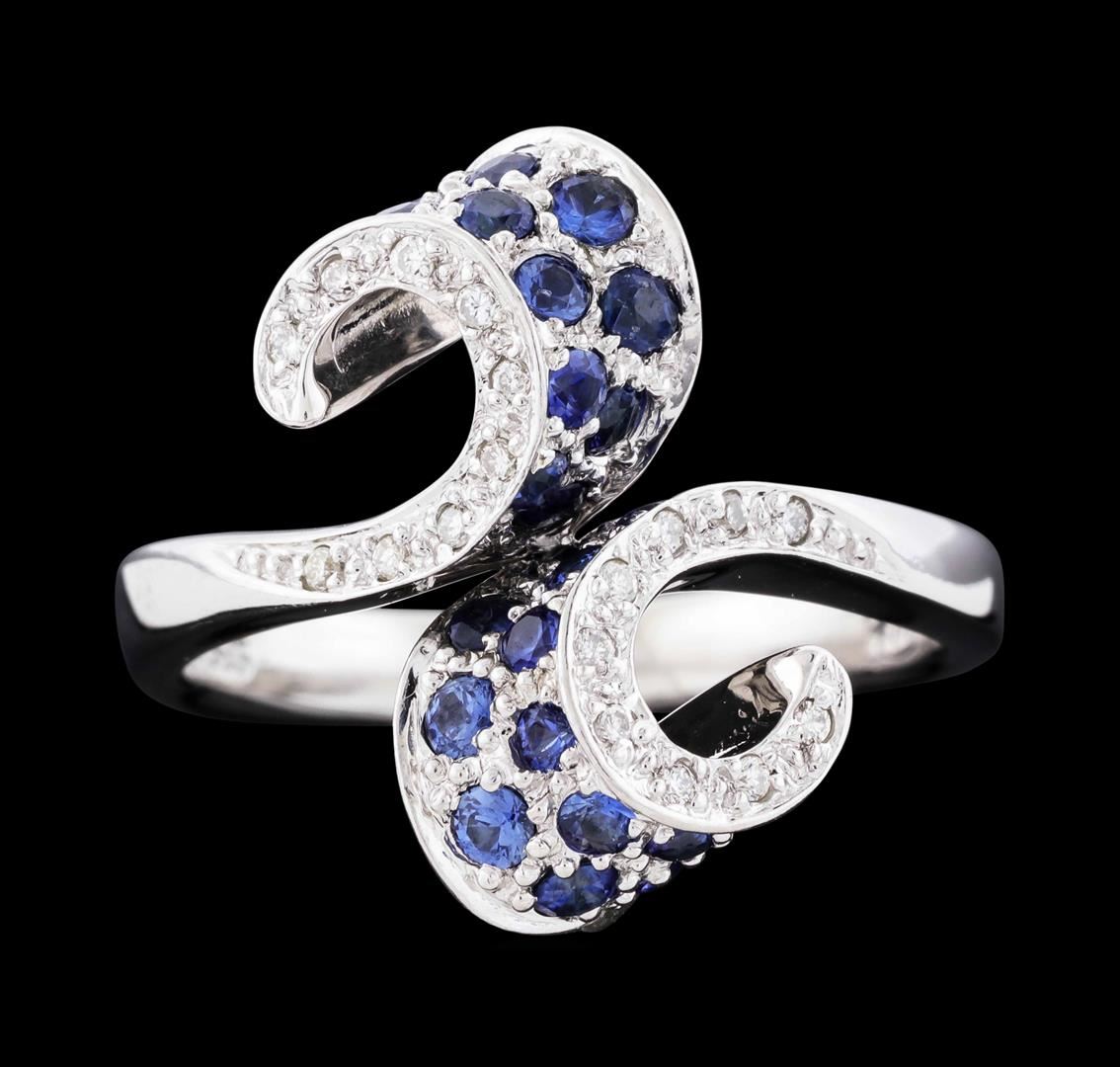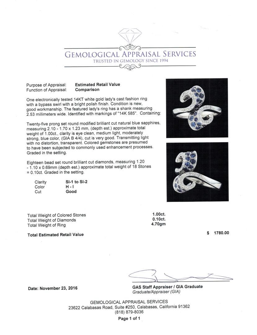 One electronically tested 14KT white gold lady's cast fashion ring with a bypass swirl with a bright polish finish. The featured lady's ring has a shank measuring 2.53 millimeters wide. Identified with markings of "14K 585". Condition is new, good workmanship. Containing: Twenty-five prong set round modified brilliant cut natural blue sapphires, measuring 2.10 - 1.70 x 1.23 mm, (depth est.) approximate total weight of 1.00ct., clarity is eye clean, medium light, moderately strong, blue color, (GIA B 4/4), cut is very good. Transmitting light with no distortion, transparent. Colored gemstones are presumed to have been subjected to commonly used enhancement processes. Graded in the setting. Eighteen bead set round brilliant cut diamonds, measuring 1.20 - 1.10 x 0.69mm (depth est.) approximate total weight of 18 Stones = 0.10ct. Graded in the setting. Clarity: SI-1 to SI-2. Color: H - ICut Good. Total Weight of Colored Stones 1.00ct. Total Weight of Diamonds 0.10ct. Total Weight of Ring 4.70gm. GAS Appraised at $1,780.00.