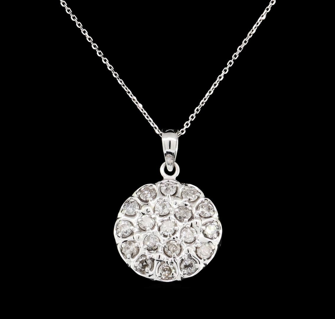 One Ladies diamond pendant and chain featuring: 14KT white gold weighing 3.1 grams containing nineteen diamonds weighing 1.00ctw.