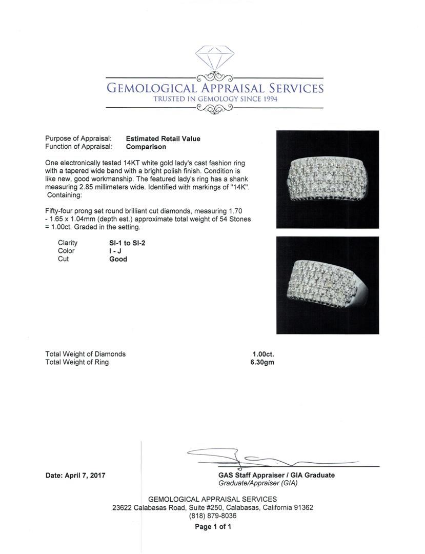 One electronically tested 14KT white gold lady's cast fashion ring with a tapered wide band with a bright polish finish. The featured lady's ring has a shank measuring 2.85 millimeters wide. Identified with markings of "14K". Condition is like new, good workmanship. Containing: Fifty-Four prong set round brilliant cut diamonds, measuring 1.70 - 1.65 x 1.04mm (depth est.) approximate total weight of 54 Stones = 1.00ct. Graded in the setting. Color I - JClarity SI-1 to SI-2 Cut Good. Total Weight of Diamonds 1.00ct. Total Weight of Ring 6.30gm. GAS Appraised.
