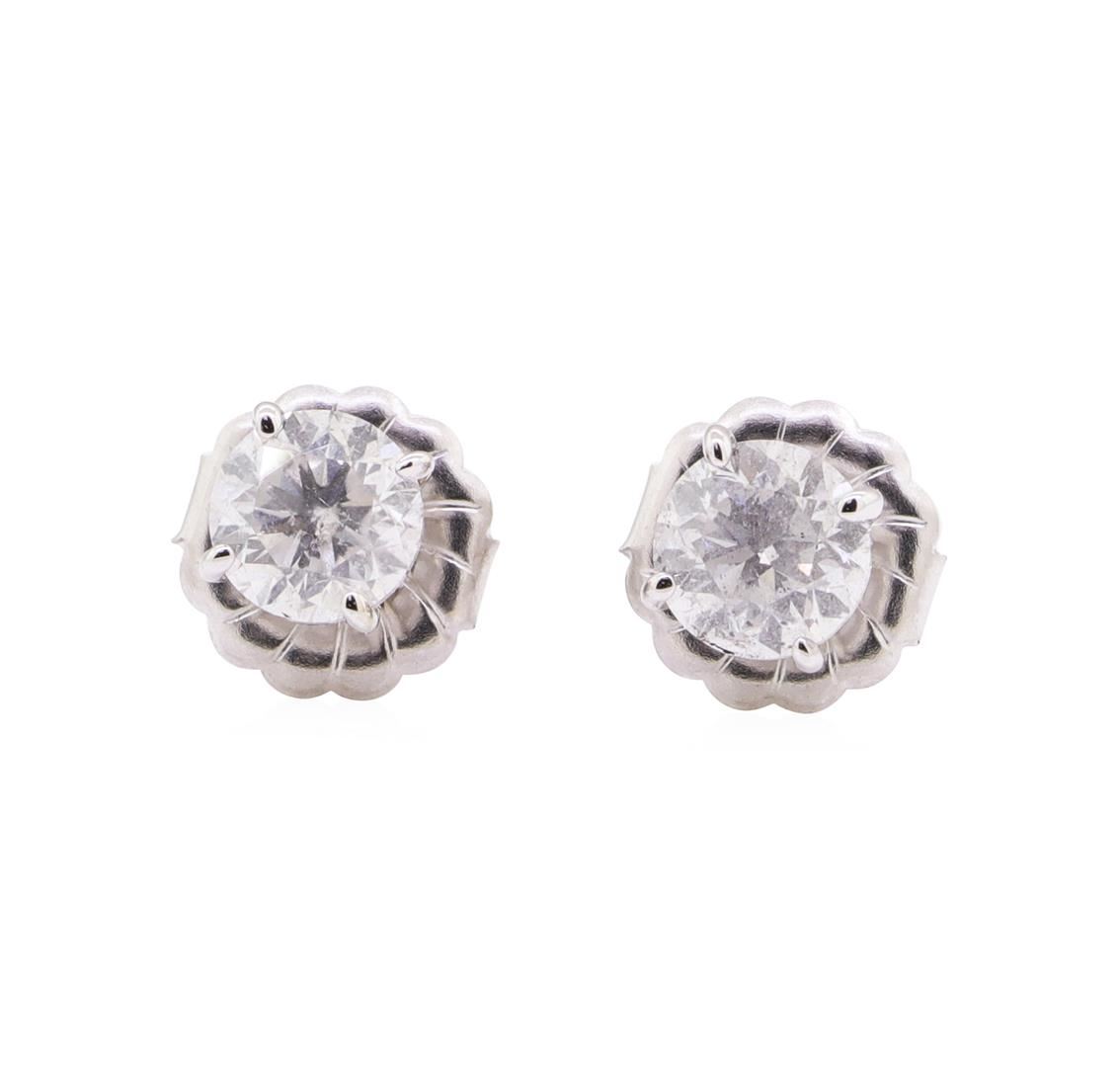 One pair electronically tested 14KT white gold lady's combination cast & assembled fashion basket stud earrings with friction posts with a bright polish finish. Identified with markings of '14K'. Condition is new, good workmanship. Containing: Two prong set round brilliant cut diamonds, measuring 4.82 - 4.70 x 3.01mm (depth est.) , 10.00.%. GTCF approximate total weight of 2 Stones = 1.01ct. Graded in the setting. Color H - I, Clarity I-1, Cut Very Good. Total Weight of Diamonds 1.01ct. Total Weight of Earrings 1.00gm. GAS Appraised.
