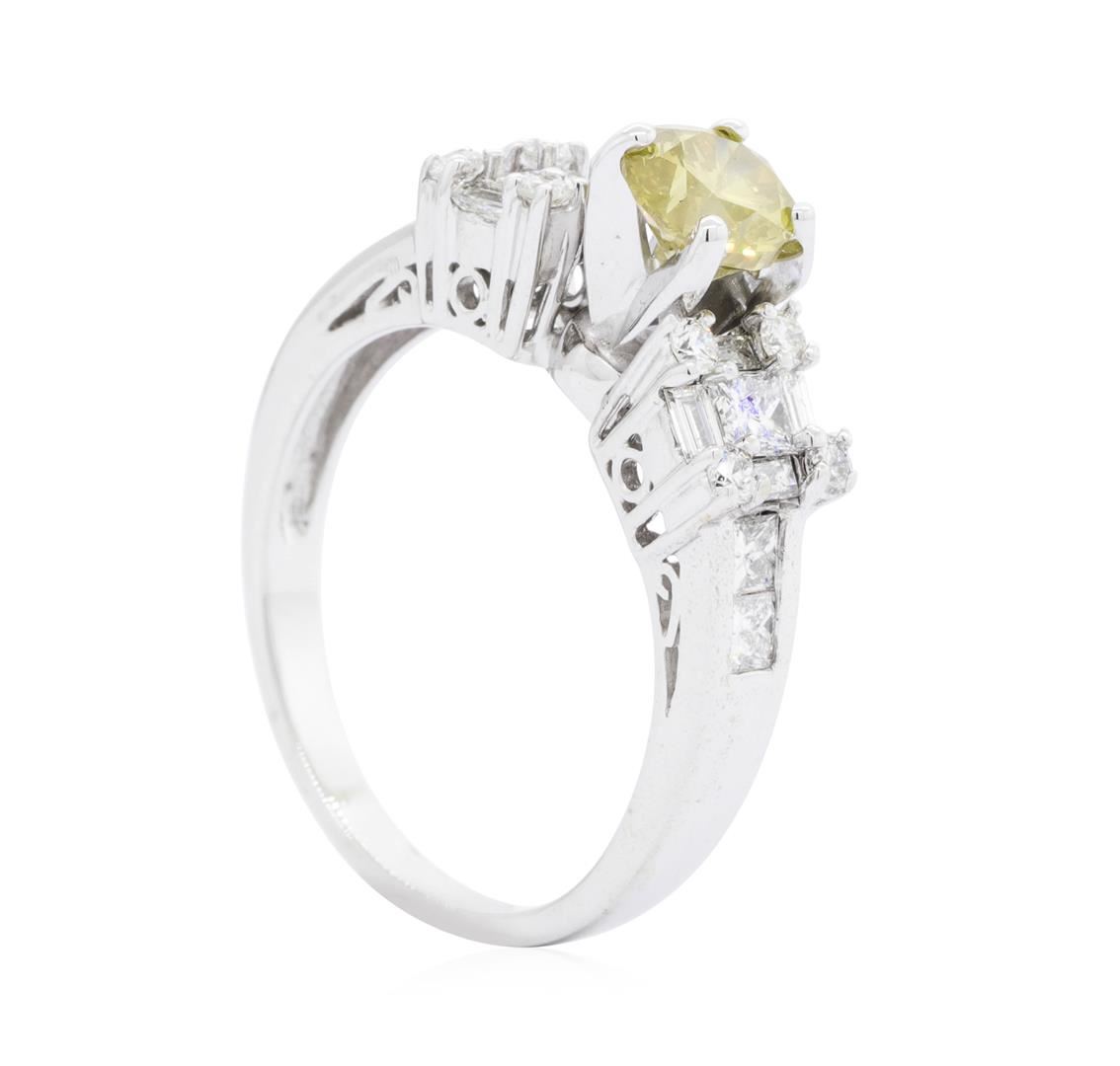 One electronically tested 14KT white gold Ladies cast wedding ring with a bright polish finish. The featured Ladies ring has a shank measuring 2.30 millimeters wide. Condition is like new, good workmanship. Containing: One prong set round brilliant cut treated diamond, measuring 6.10 - 6.02 x 4.00mm (depth est.) , 10.00.%. GTCF approximate weight of 1.01ct. Colored gemstones are presumed to have been subjected to commonly used enhancement processes. Graded in the setting. Color Fancy Orangy Brownish Yellow Clarity SI-1 Cut Fair Six channel set princess cut diamonds, measuring 2.50 x 2.10 x 1.58mm (depth est.) approximate total weight of 6 Stones = 0.42ct. Graded in the setting. Color G - H Clarity VS-1 to VS-2 Cut Very Good Eight prong set baguette cut diamonds, measuring from 2.20 x 1.50 x 1.28mm (depth est.) to 2.30 x 1.60 x 1.36mm (depth est.) approximate total weight of 8 Stones = 0.34ct. Graded in the setting. Color G - H Clarity VS-2 to SI-1 Cut Very Good Eight prong set round brilliant cut diamonds, measuring 2.00 - 1.95 x 1.23mm (depth est.) approximate total weight of 8 Stones = 0.24ct. Graded in the setting. Color G - H Clarity VS-2 to SI-1 Cut Good. Total Weight of Diamonds 2.01ct. Total Weight of Ring 5.90gm. GAS Appraised.
