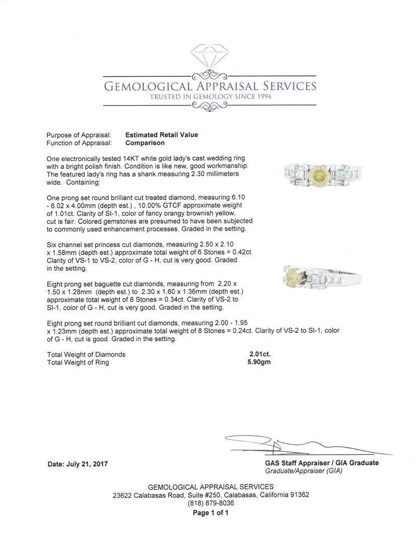 One electronically tested 14KT white gold Ladies cast wedding ring with a bright polish finish. The featured Ladies ring has a shank measuring 2.30 millimeters wide. Condition is like new, good workmanship. Containing: One prong set round brilliant cut treated diamond, measuring 6.10 - 6.02 x 4.00mm (depth est.) , 10.00.%. GTCF approximate weight of 1.01ct. Colored gemstones are presumed to have been subjected to commonly used enhancement processes. Graded in the setting. Color Fancy Orangy Brownish Yellow Clarity SI-1 Cut Fair Six channel set princess cut diamonds, measuring 2.50 x 2.10 x 1.58mm (depth est.) approximate total weight of 6 Stones = 0.42ct. Graded in the setting. Color G - H Clarity VS-1 to VS-2 Cut Very Good Eight prong set baguette cut diamonds, measuring from 2.20 x 1.50 x 1.28mm (depth est.) to 2.30 x 1.60 x 1.36mm (depth est.) approximate total weight of 8 Stones = 0.34ct. Graded in the setting. Color G - H Clarity VS-2 to SI-1 Cut Very Good Eight prong set round brilliant cut diamonds, measuring 2.00 - 1.95 x 1.23mm (depth est.) approximate total weight of 8 Stones = 0.24ct. Graded in the setting. Color G - H Clarity VS-2 to SI-1 Cut Good. Total Weight of Diamonds 2.01ct. Total Weight of Ring 5.90gm. GAS Appraised.