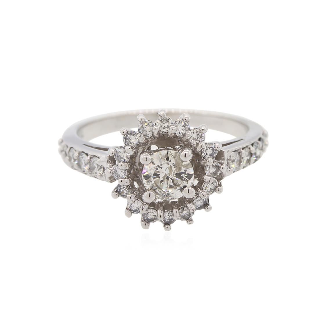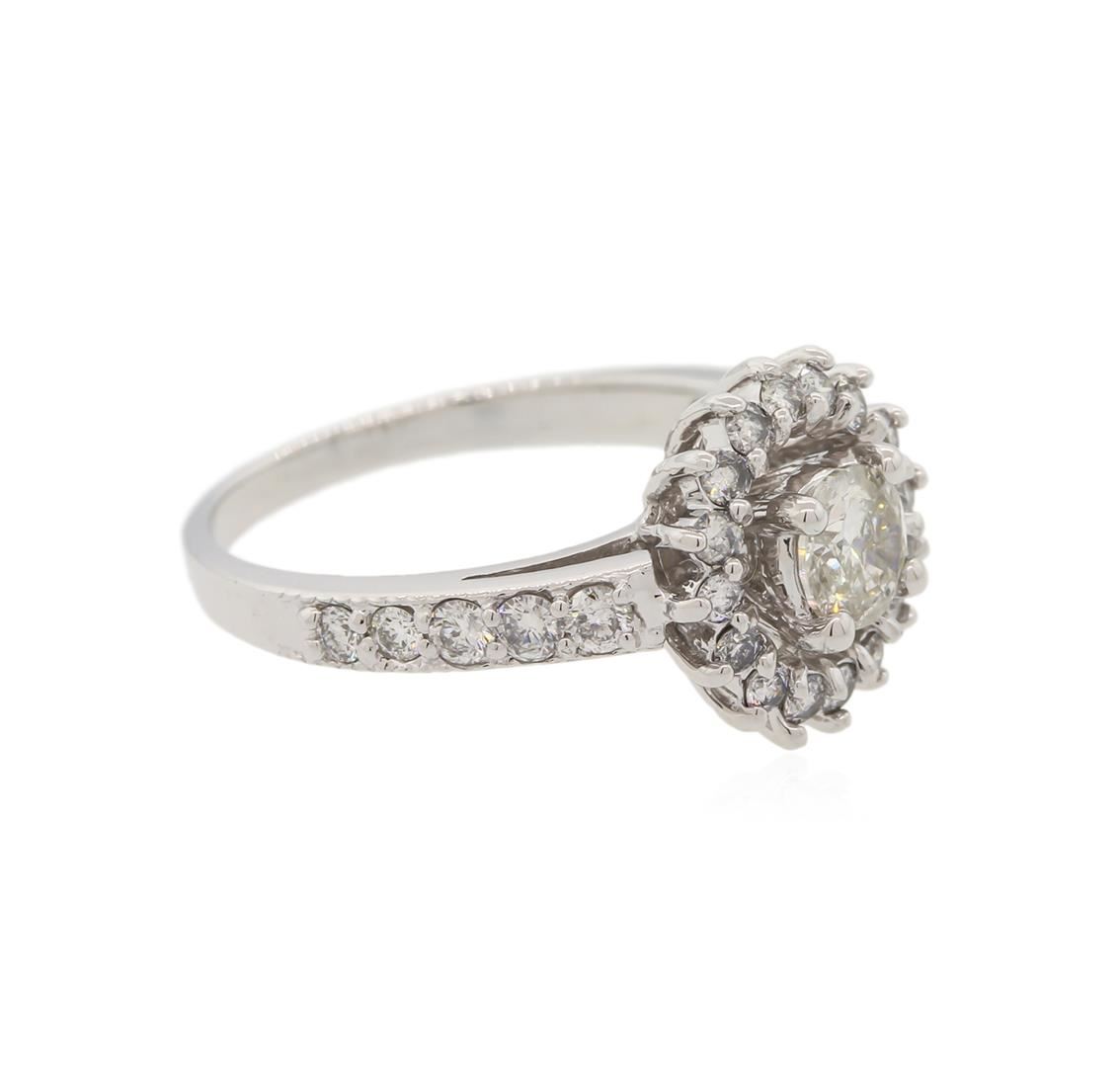 One electronically tested 14KT white gold lady's combination cast & assembled wedding ring with a basket halo with a bright polish with milgrain detailing finish. The featured lady's ring has a shank measuring 1.86 millimeters wide. Identified with markings of "K14". Condition is new, good workmanship. Containing: One prong set round brilliant cut diamond, measuring 4.96 - 4.92 x 3.01mm (depth est.) approximate weight of 0.45ct. Graded in the setting. Clarity: I-1. Color: Very Good Ten prong set round brilliant cut diamonds, measuring 2.00 - 1.80 x 1.24mm (depth est.) approximate total weight of 10 Stones = 0.30ct. Graded in the setting. Clarity: SI-2 to I-1. Color: H - I. Cut Good Sixteen prong set round brilliant cut diamonds, measuring 1.70 - 1.60 x 0.99mm (depth est.) approximate total weight of 16 Stones = 0.26ct. Graded in the setting. Clarity: SI-1 to SI-2. Color: H - I. Cut Good. Total Weight of Diamonds 1.01ct. Total Weight of Ring 3.70gm. GAS Appraised at $3,950.00.